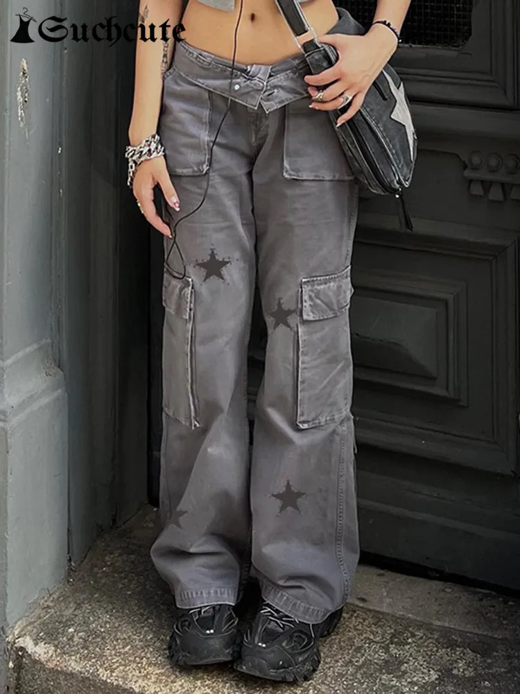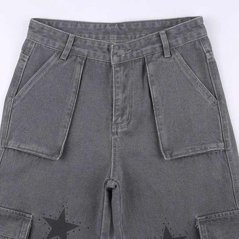 FREE SHIPPING Y2K Streetwear Cargo Jeans Grey Star Print JKP5981
