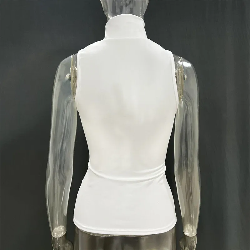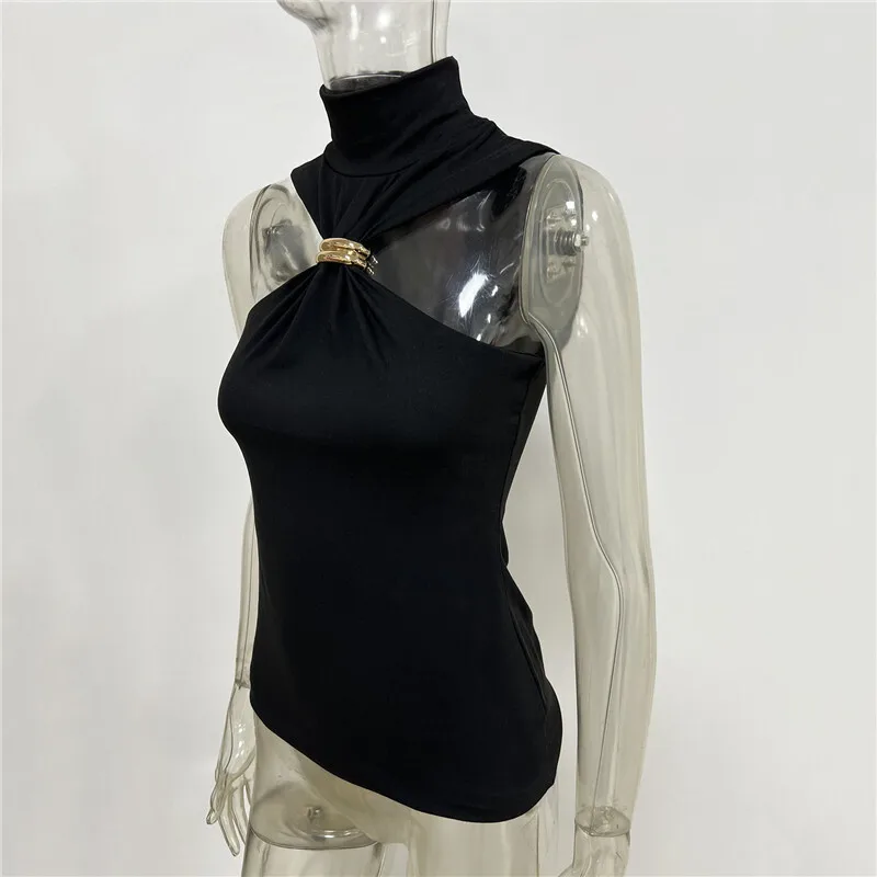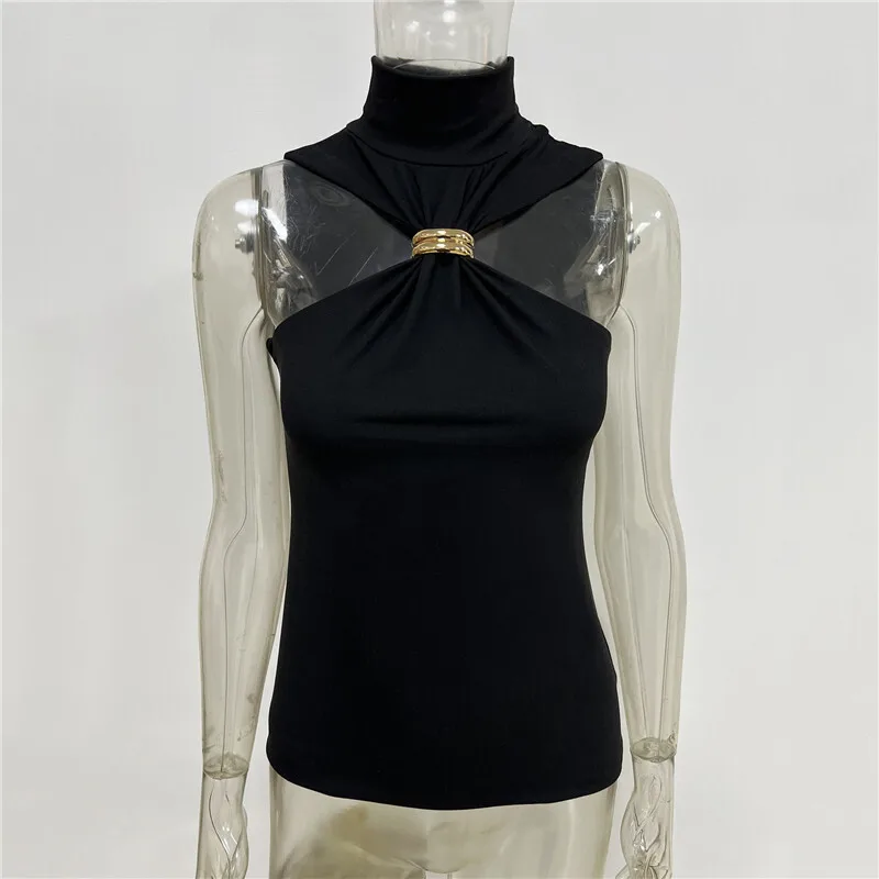 FREE SHIPPING Y2K Turtleneck Knit Crop Top Sleeveless Metal Ring Camisole JKP7309