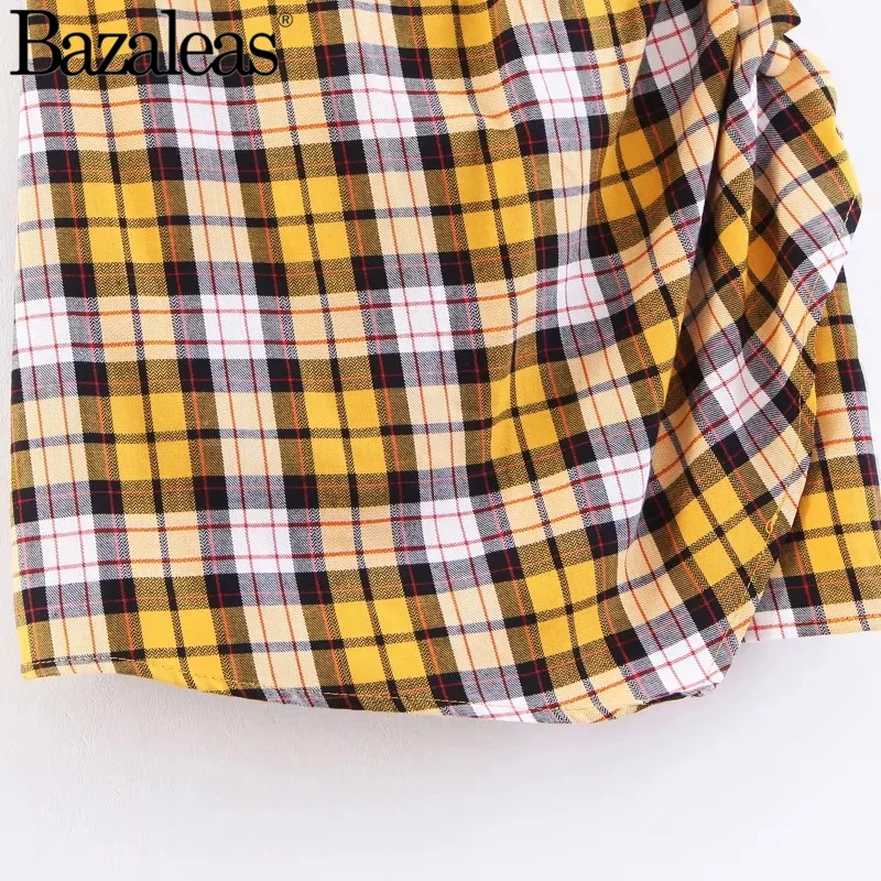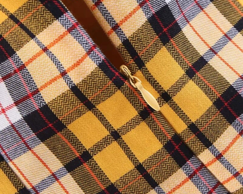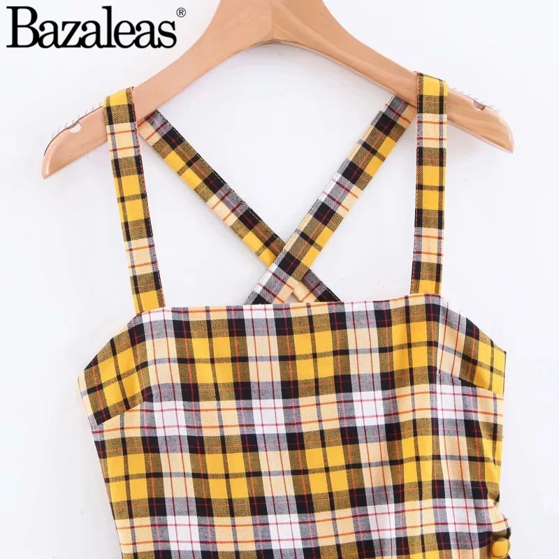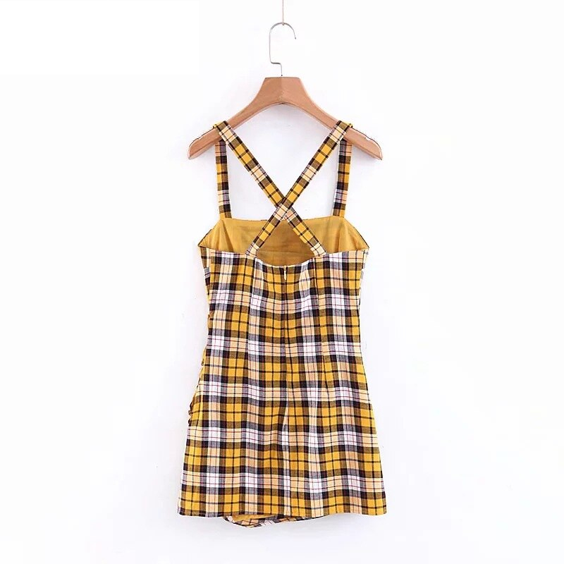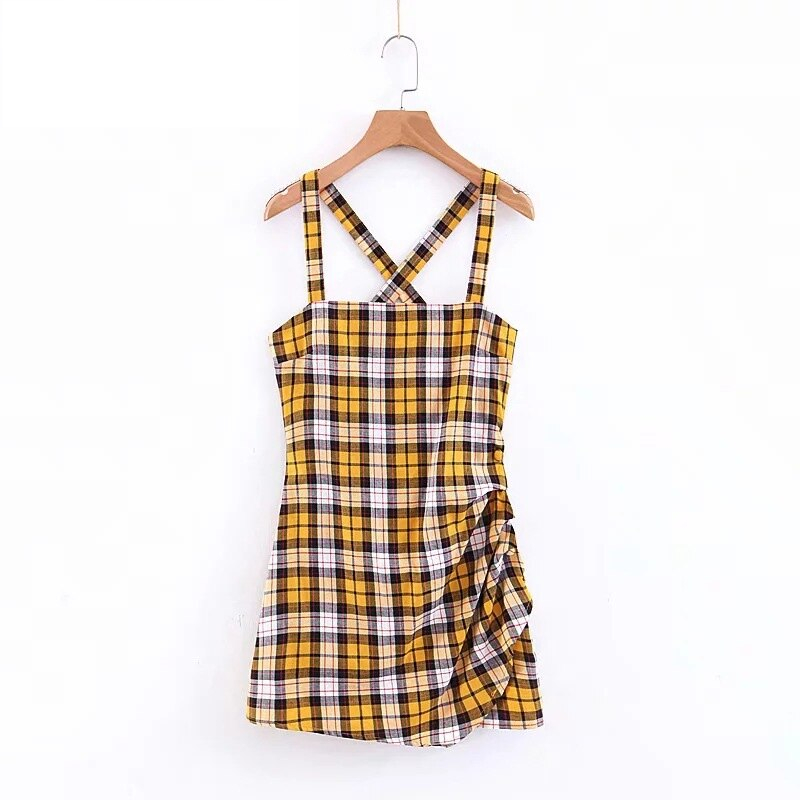 FREE SHIPPING Yellow Plaid Women dress Mini Dresses Vestidos Casual Dress Back Cross Dress Spaghetti Strap Sleeveless JKP2160