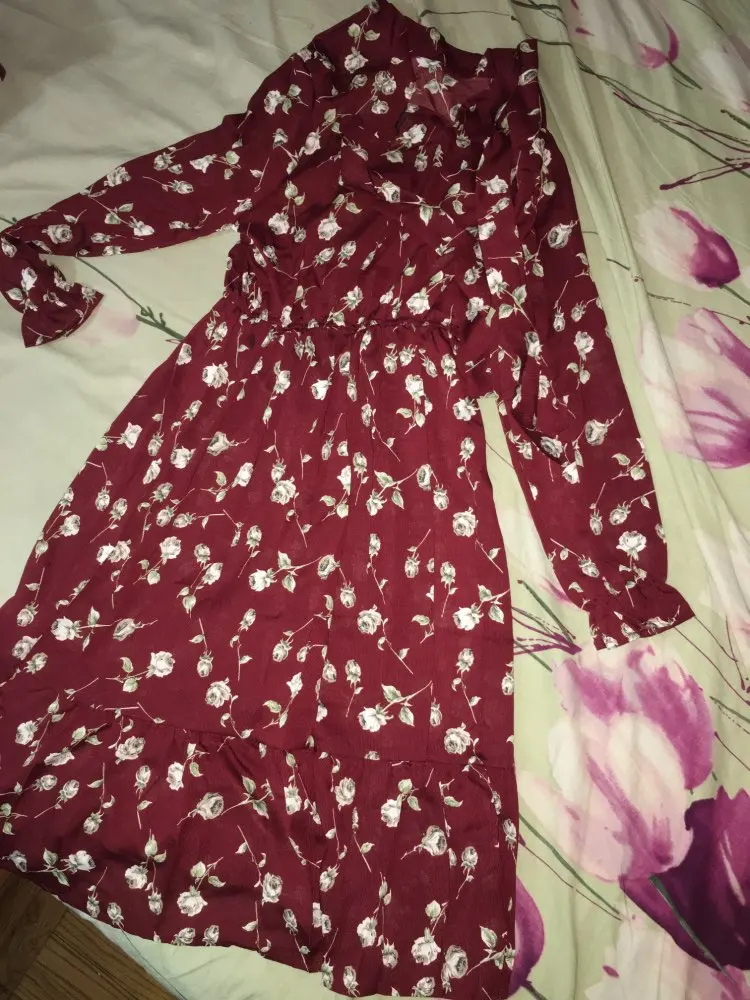 Dress chic! I liked it very much. Delivery is almost a month. Threads do not stick out and sewed neatly, i thought that it would be a little lighter but it came in a dark burgundy color. (The photos looks lighter than really) and so everything is good!