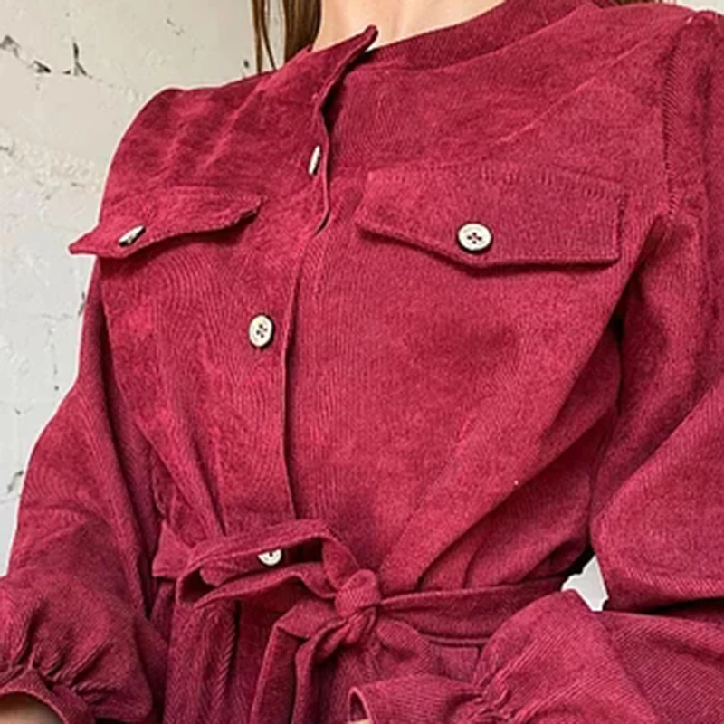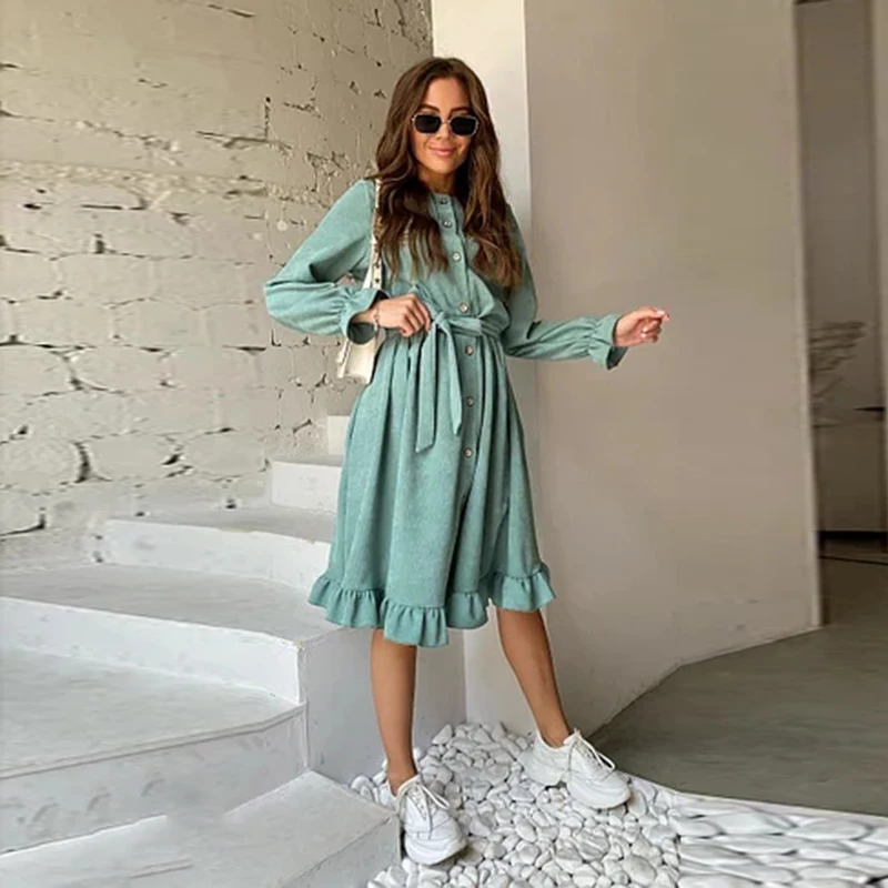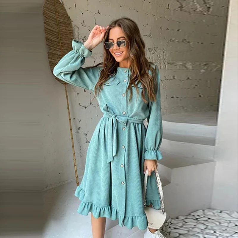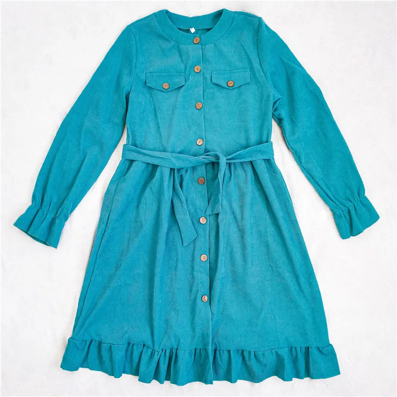 FRESS SHIPPING Casual Corduroy Dress Flare Sleeve Single Breasted O-Neck With Belt JKP6066