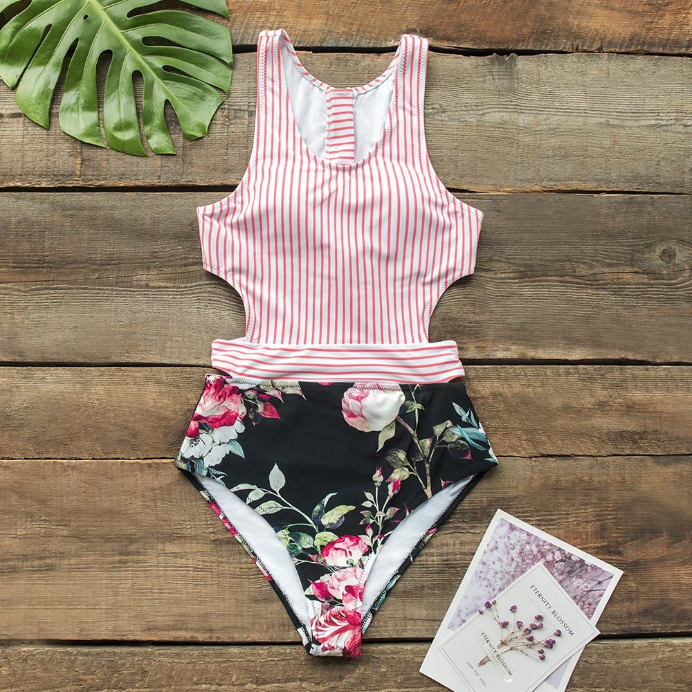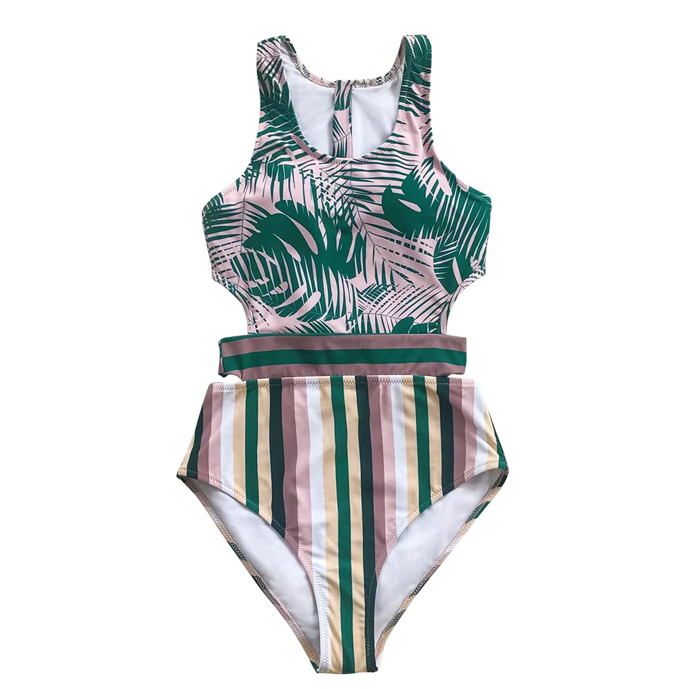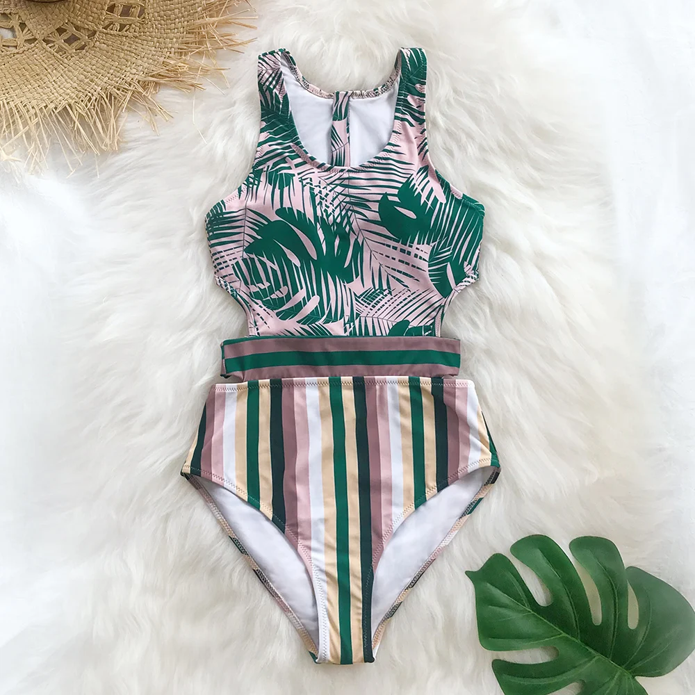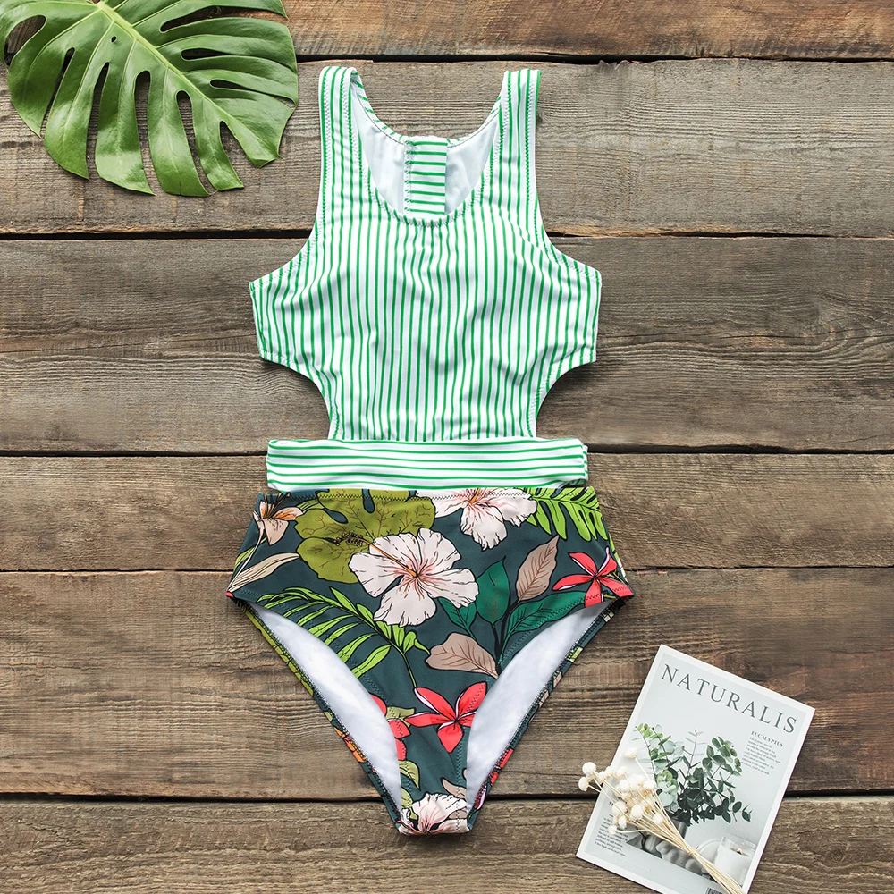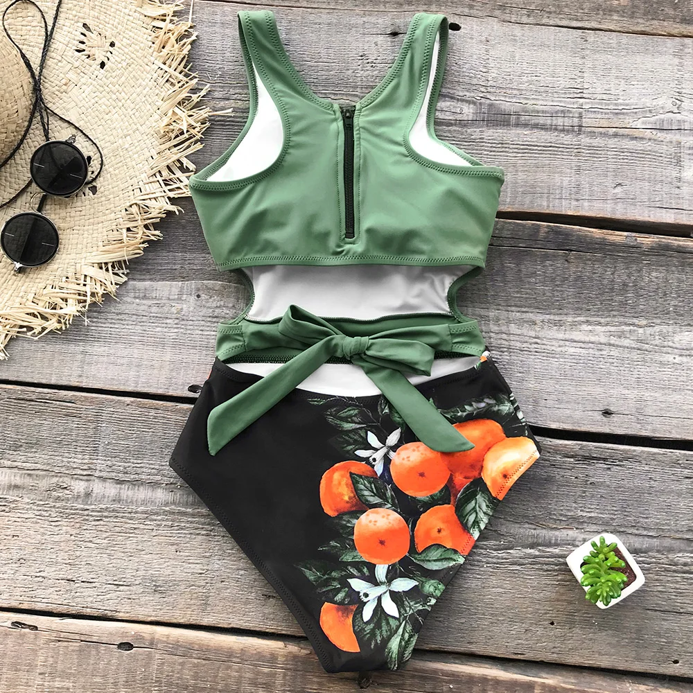 Green Miss U Print One-piece Swimsuit Tied Bow Cutout Tank Monokini