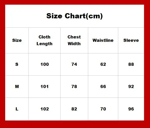 | Size | Cloth Length | Chest Width | Waistline | Sleeve |