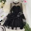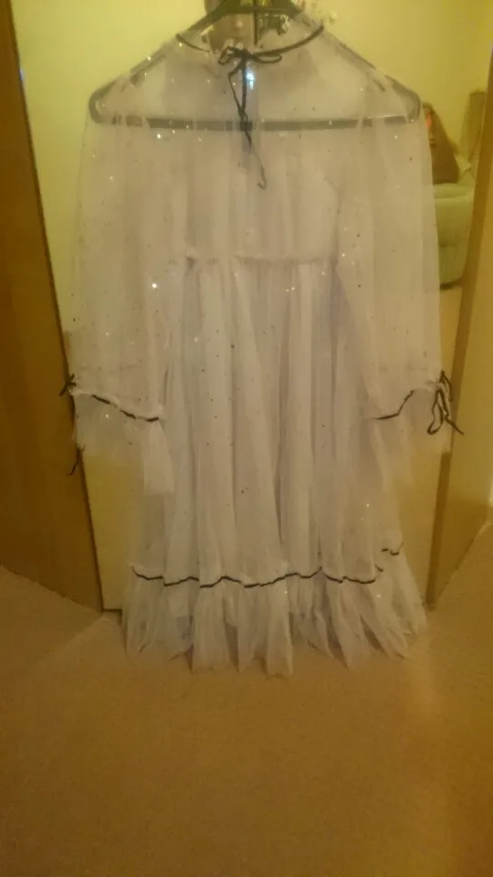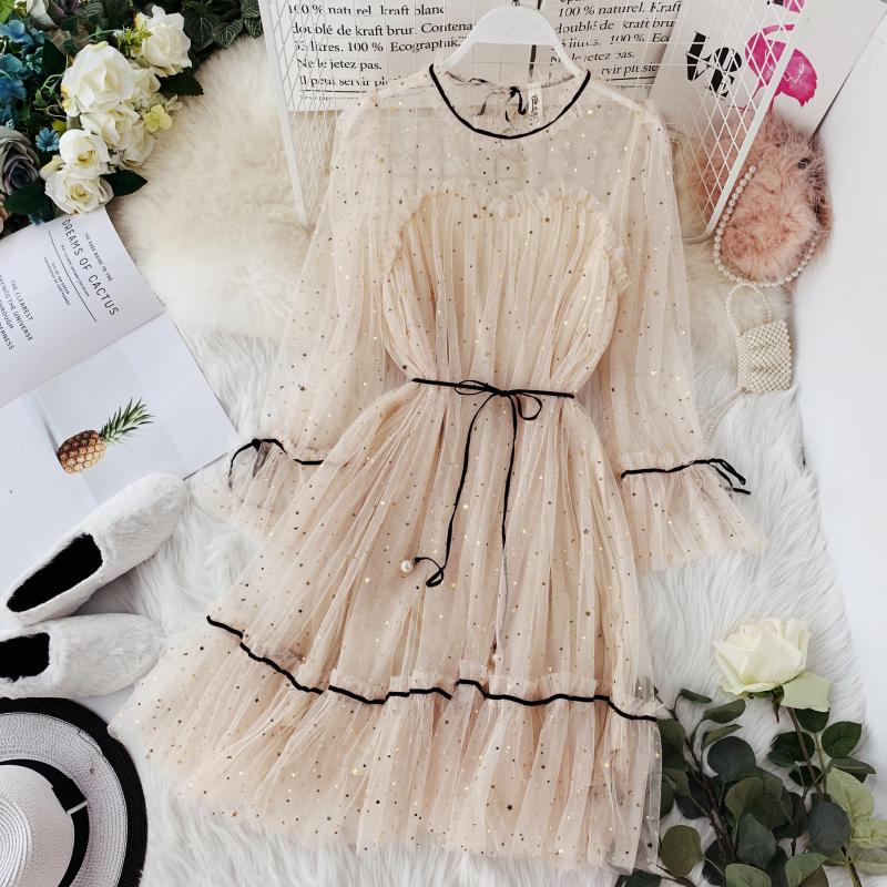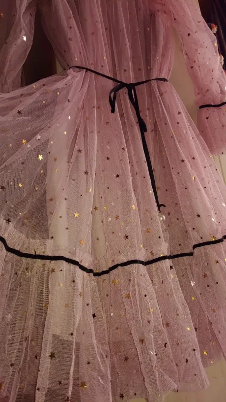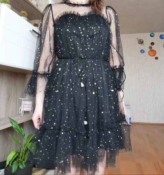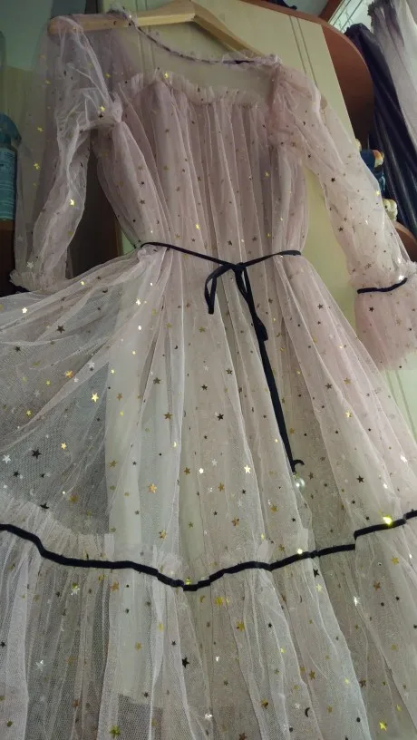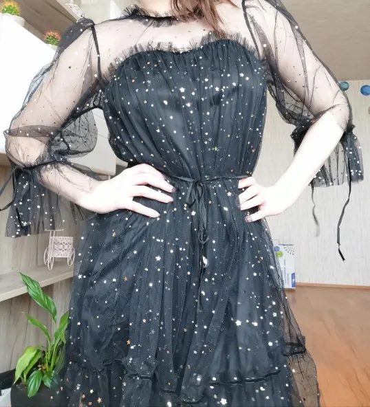 A good dress for your money. The mesh itself is a little pricked, but not critical, since under it there is a lining of quite pleasant to the body fabric. The seams are very neat, the threads do not stick out anywhere. Suitable for any girth of the hands, as on the sleeves there are cuts and ties. The truth to put on carefully-these cuts easily tear. In the kit was a belt. On the height of 168 the lining of centimeters is 10 above the knee, and the net is about 4-5 cm.