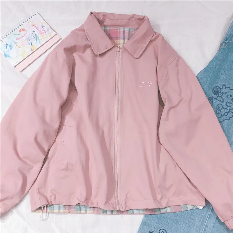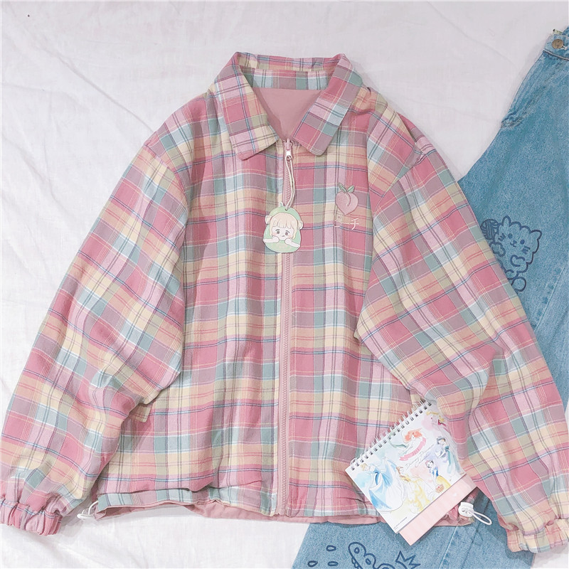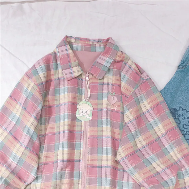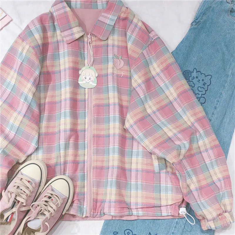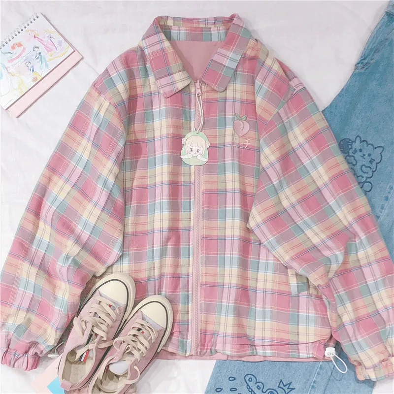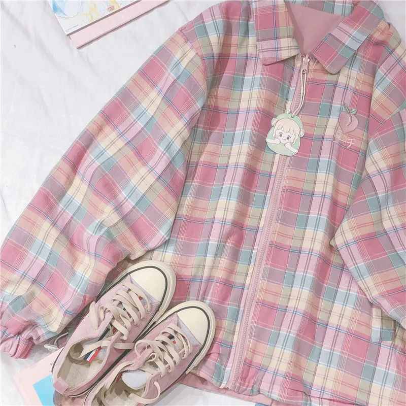 Japanese Plaid Coat Long Sleeve Oversized Rainbow Bomber Jacket 2020 Autumn Both Sides Wear Jackets Causal Clothes