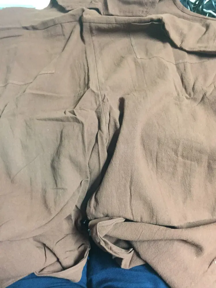 Fast shipping, tracked all the way. Fits great. Im 5'7 and curvy. i wanted a baggy fit for this so i sized up to make sure it was big, bit i think i could have picked a regular size of xxl. Thick, good, linen material. Straps have no buttons, but loop through holes and tie. i really