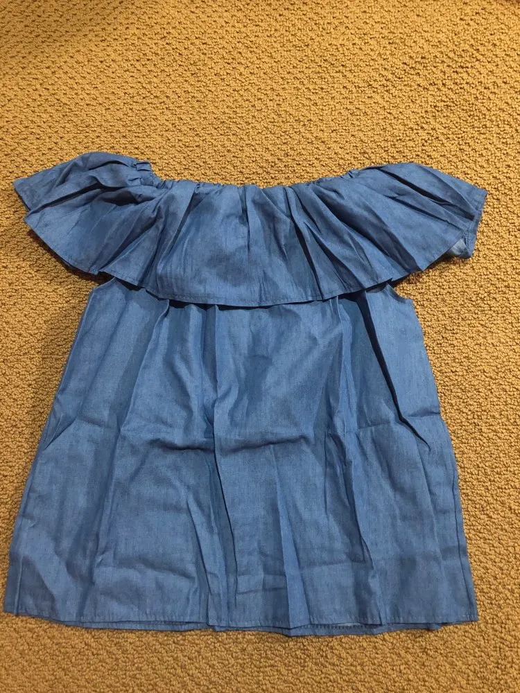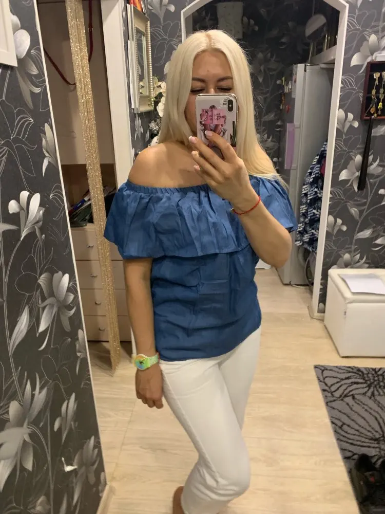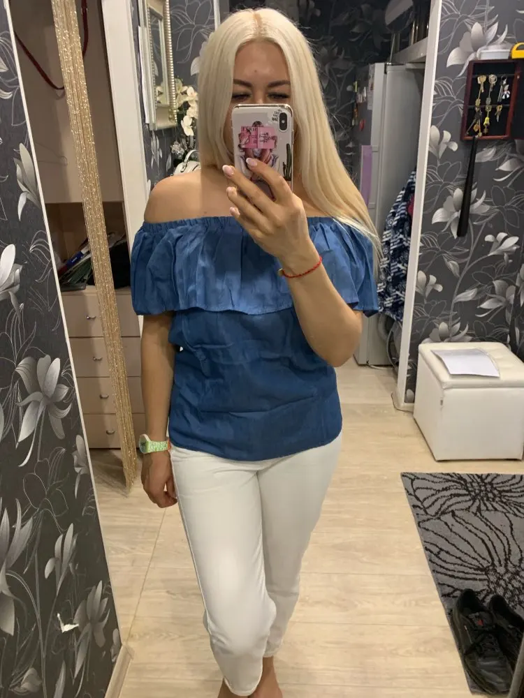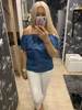JUKPOP Vintage Off Shoulder Denim Solid Blue Costume Ruffle Summer Slash Neck Casual Loose Top Blouse JKP2450