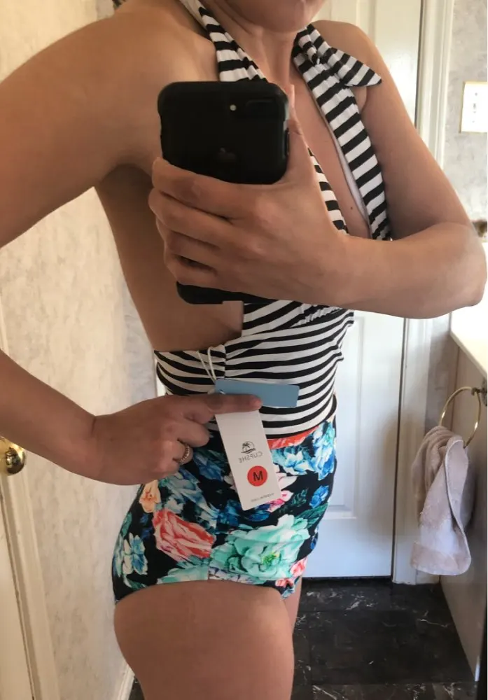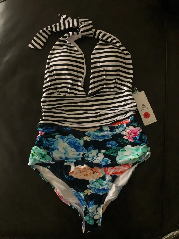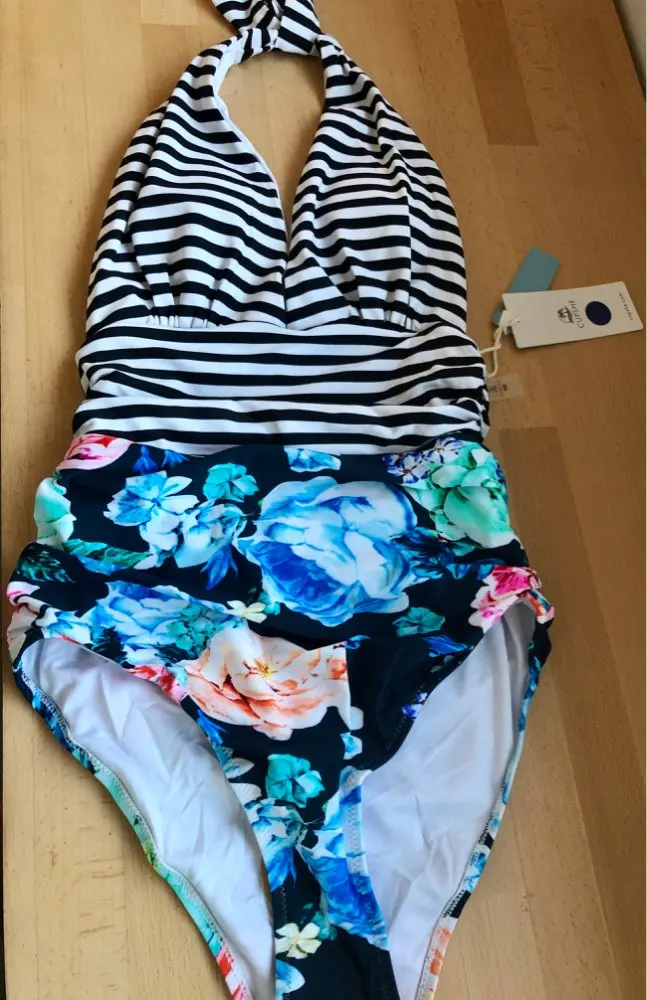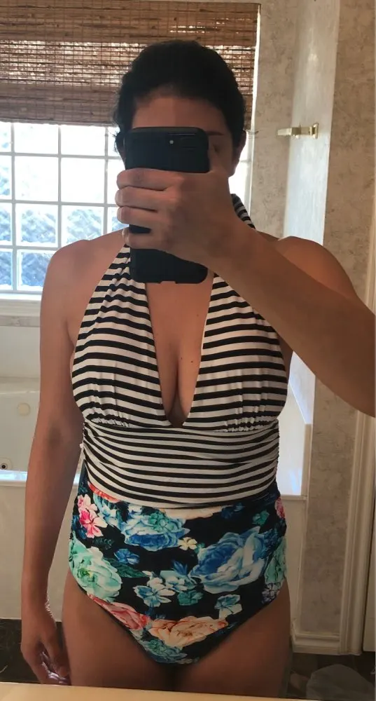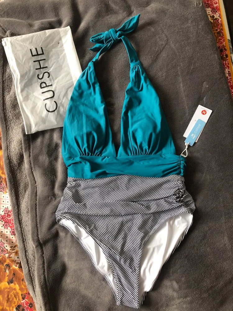 Great quality swimsuit for an affordable price. I want more now!!! The sizing is accurate. Go with your true size. I am usually a size 4/6 and I probably could have ordered a small but purchased a medium but it works without being too loose. The only thing I saw I didn’t like was that there’s a seam on the busy part that looks a little awkward to me but maybe I’m being too picky. The color is vibrant. They do have removable pads and I love have you can adjust the halter since it ties. Beautiful!!! Thanks CUPSHE!!! This arrive to me (USA) in about a week...SUPER FAST DELIVERY!