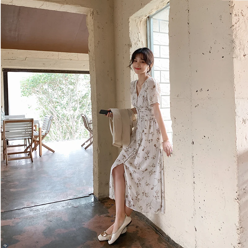 Korean Floral Printed Boho Dress Elegant Long Dress