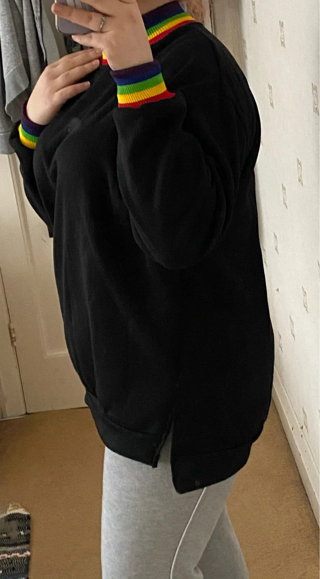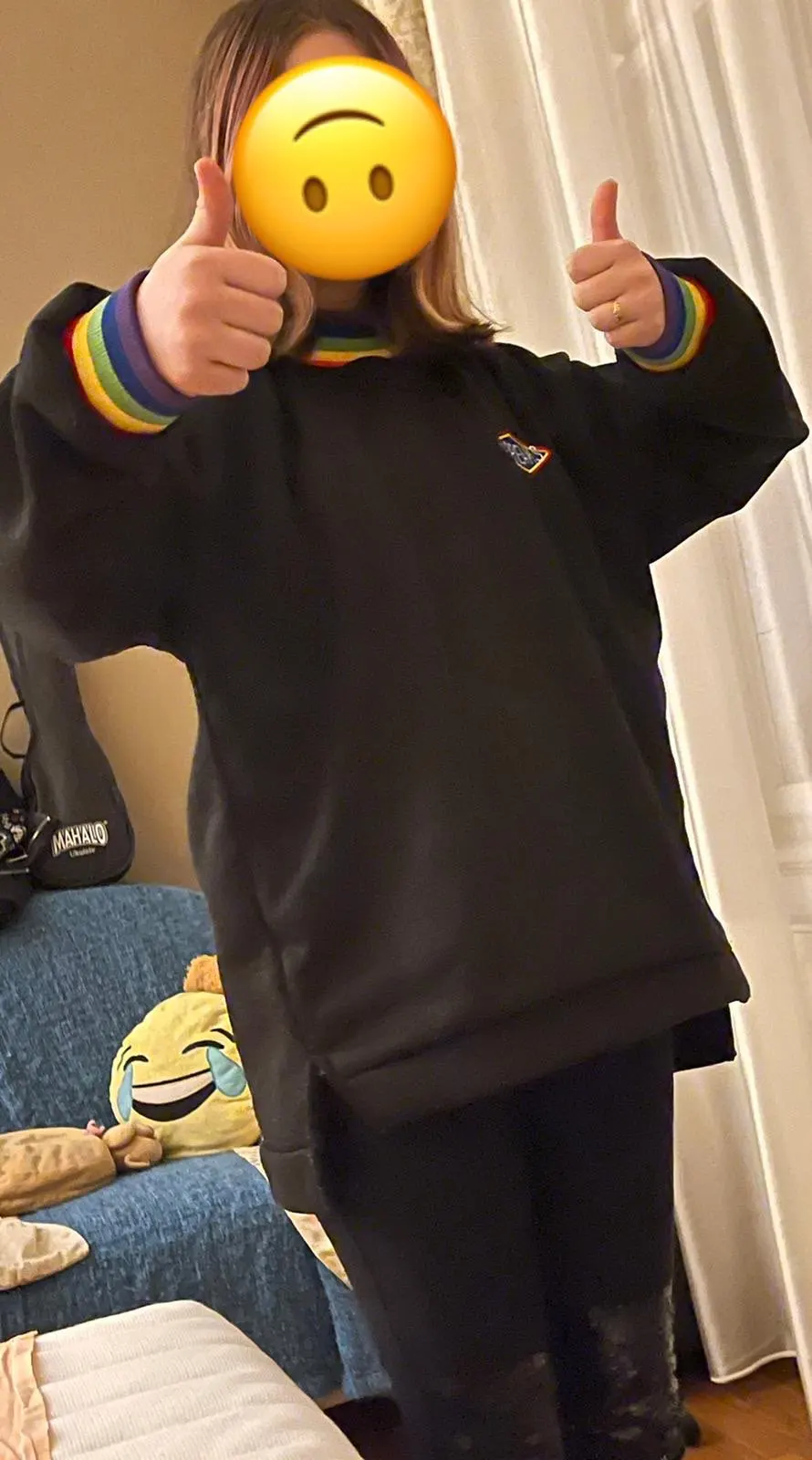 Very satisfied with the sweatshirt, excellent quality. Smooth seams, nice material, odorless. Excellent sleeves are long. I took L sat down as I wanted, a little freely. Definitely recommend. The sweatshirt really liked-dense, soft, warm. Nice color.sooo good oversize.