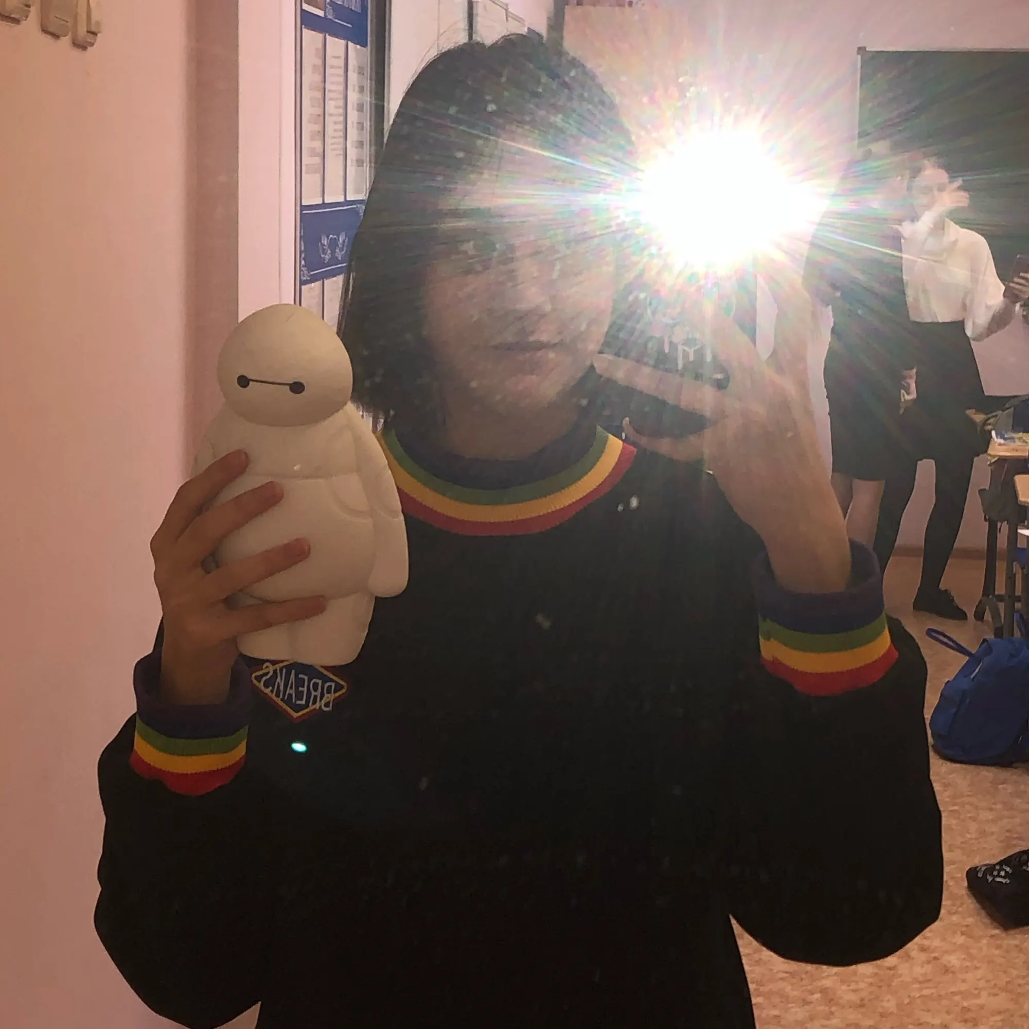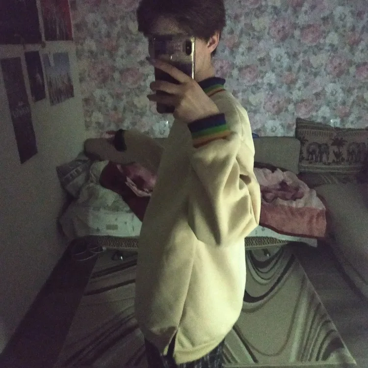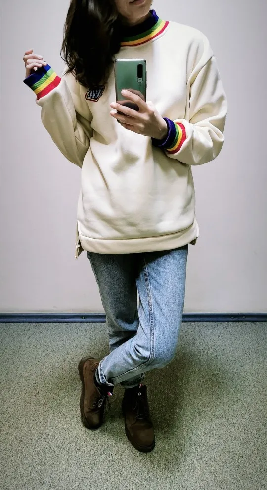 Cute and very warm sweatshirt. I wear 42 size (XS-S), my height is 168, I hang 49 kg. Ordered XXL-as sits look at the photo. If you want straight oversize, as on the model, then take the largest size, you will not lose. The shoulders are wide, the color is milky, yellowish even. We now have frosts, minus the 23-jacket is ideal for this time))