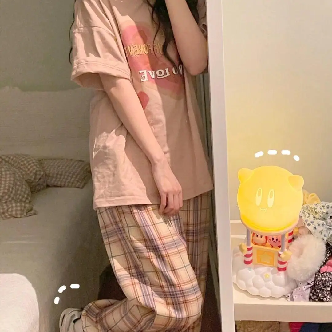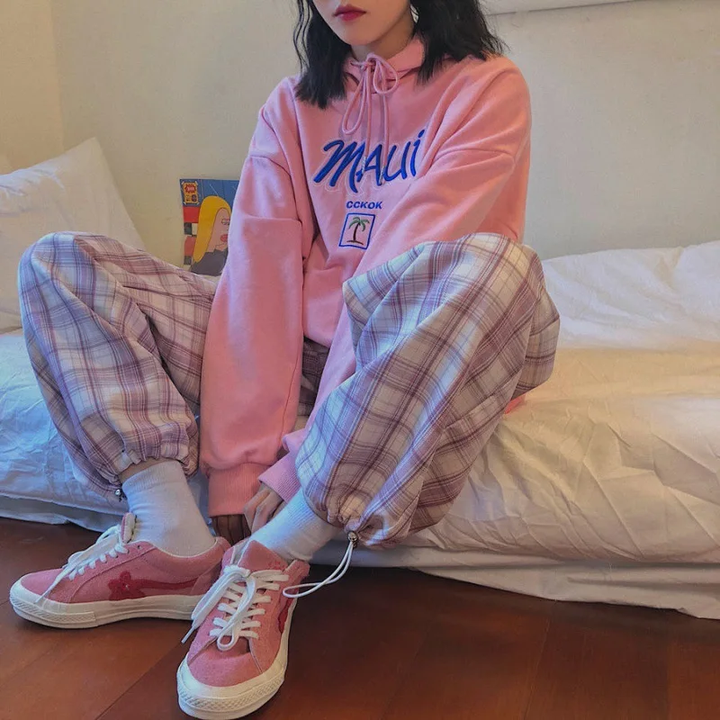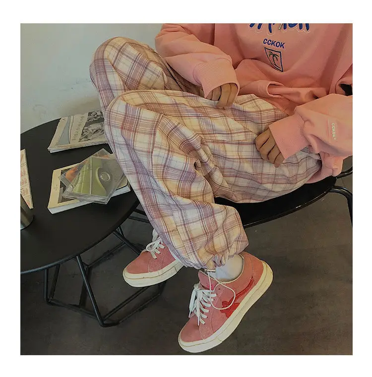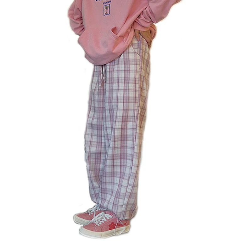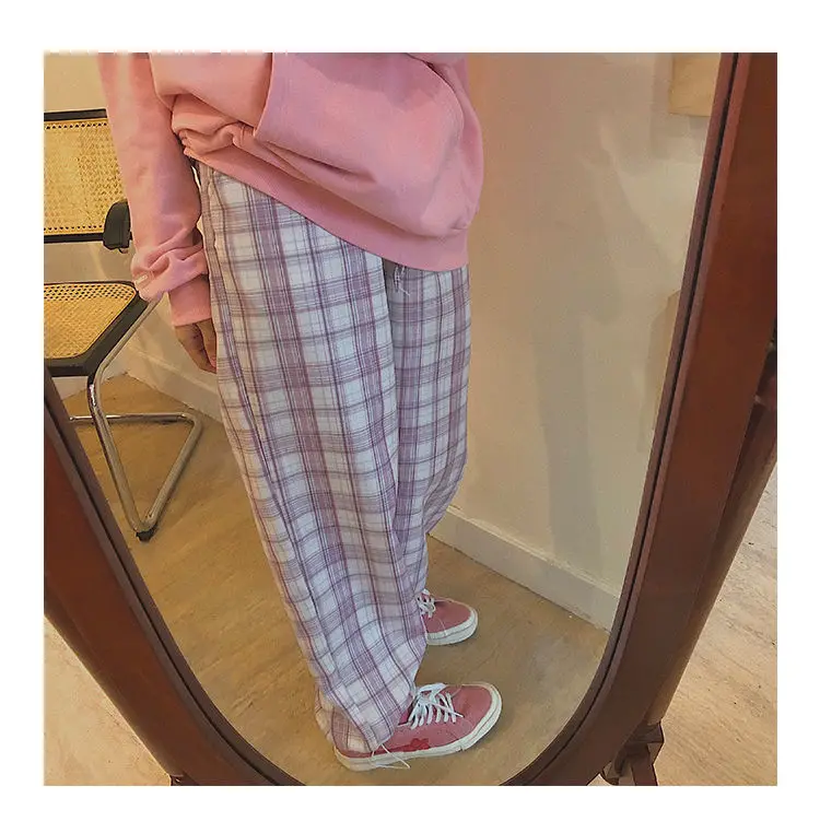 Korean Vintage Pink Plaid Wide Leg Pants With Pockets JKP4784