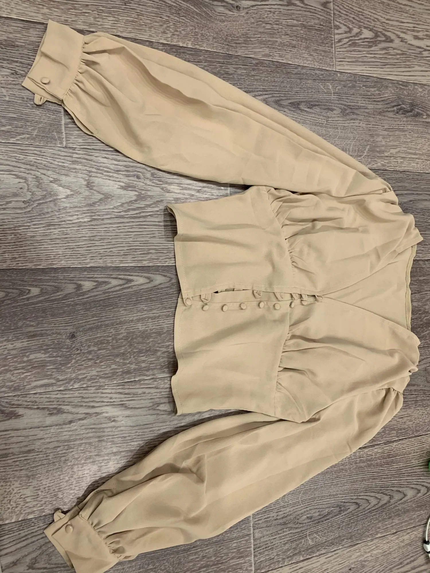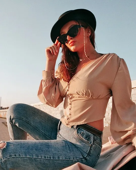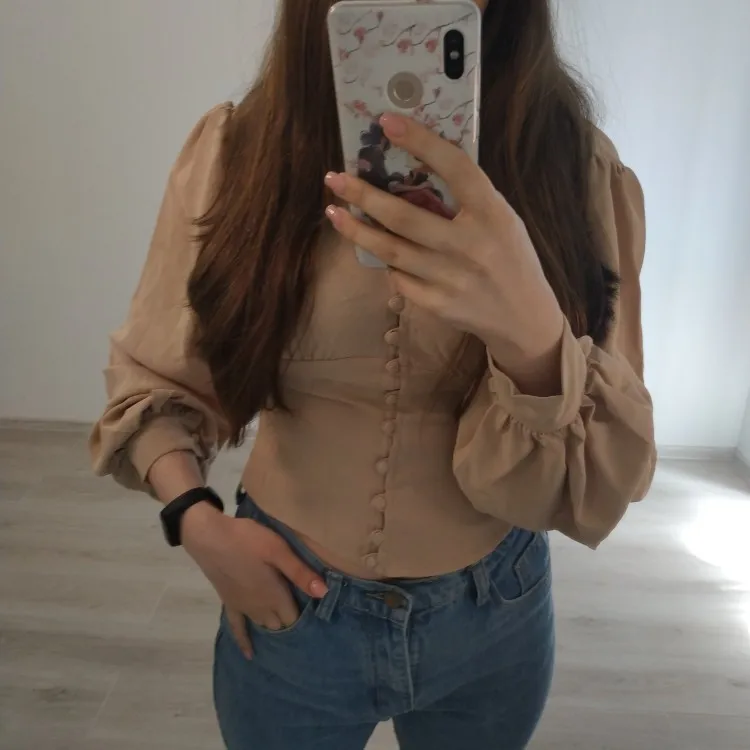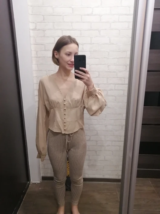 Блузка реально короткая, прям вот до пупка) надевала с брюками с высокой талией, все ок. Если посадка у вещи занижена будете щеголять с голой поясницей и пузом) материал- синтетика. Длина рукавов хорошая. Ткань приятна к телу. Пуговицы и петельки сделаны хорошо! Брать советую. Блузка смотрится очень выигрышно. На 44 размер брала м, сидит хорошо, была бы больше по размеру, висела бы, в данном случае при таком фасоне висеть ничего не должно