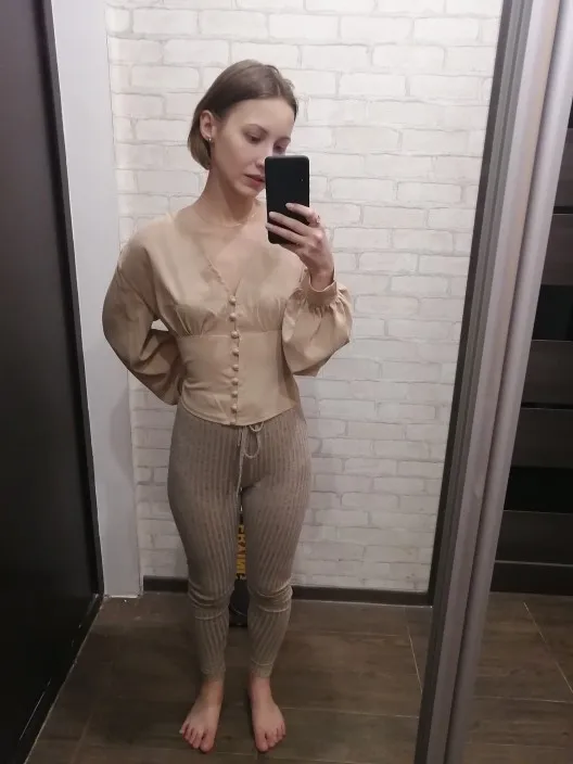 To St. Petersburg reached 19 days (together with 2 more). The shirt is very cool! On OB 85/OT 64 took M. The shirt itself is short, wear only high waist, but looks great, the seams are even, there are no threads sticking out. Advise!