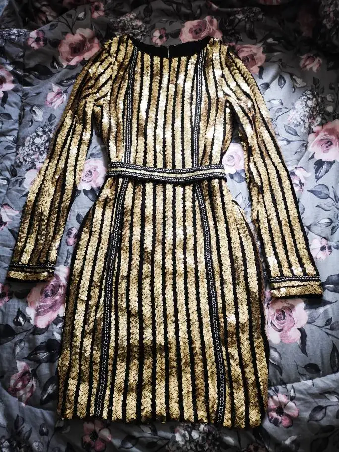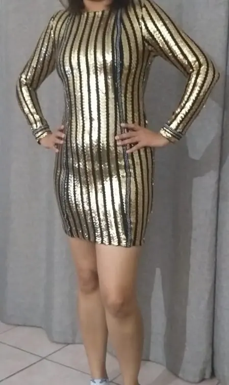 THE dress is exactly as described. IS wonderful! Arrived in just 12 days, very fast. Unbelievable!!! THE only problem was that was a little tight, not closed the back zipper. I use M normally asked. So suggest order one above. Better adjust than can not do anything.