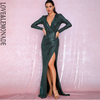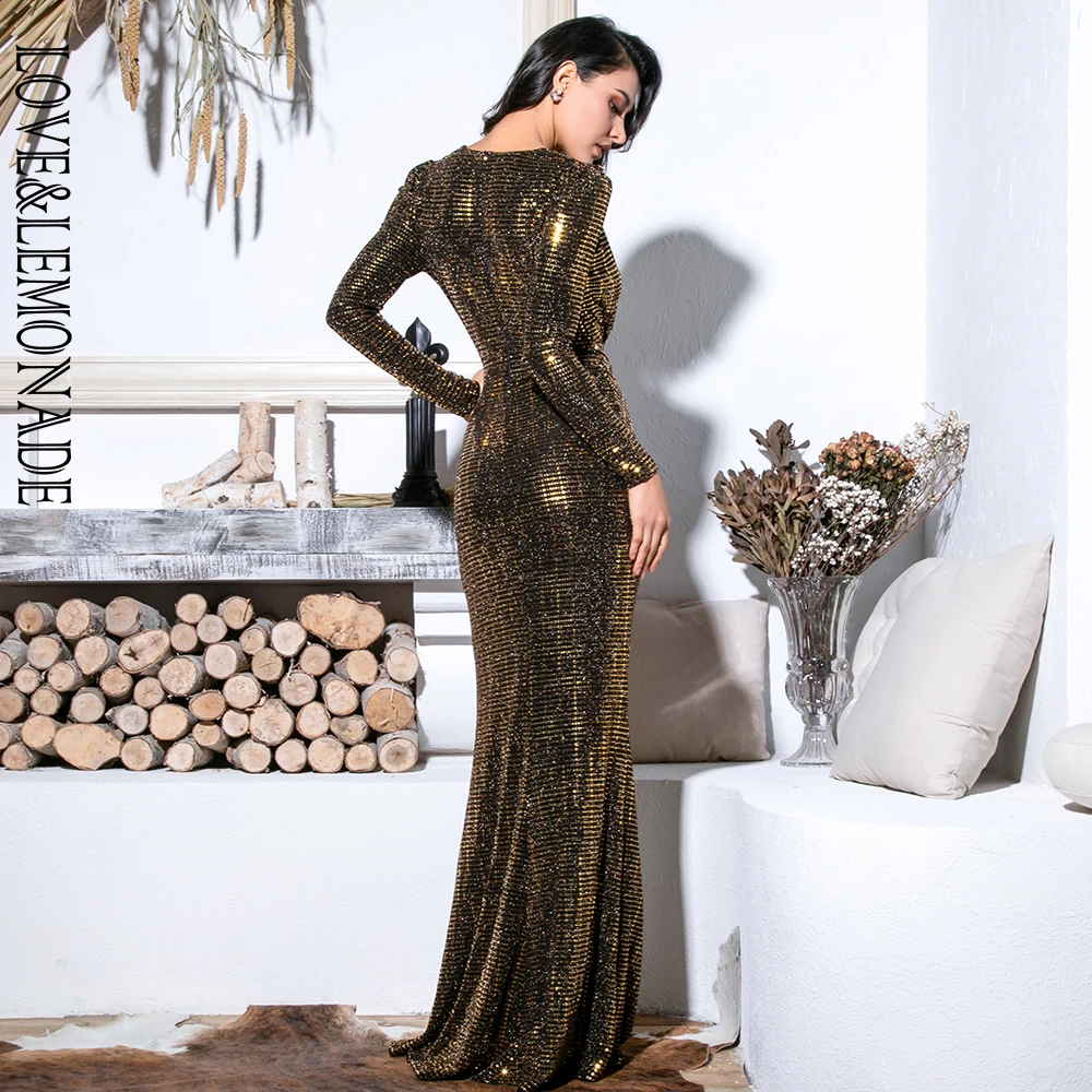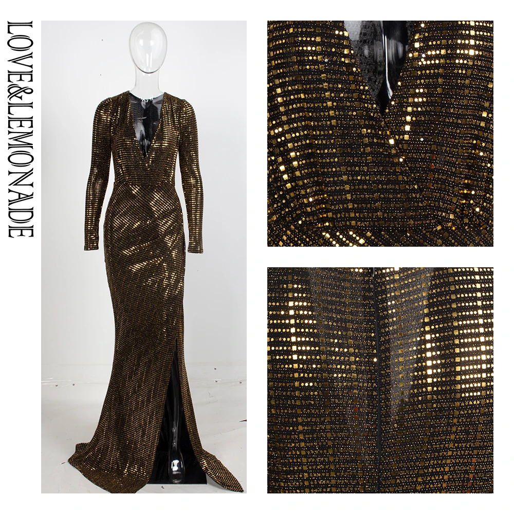 Maxi Dress Gold Deep V-Neck Cut Out Puff Sleeves Glitter Sequins Elastic Material