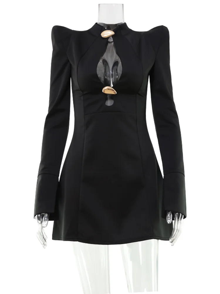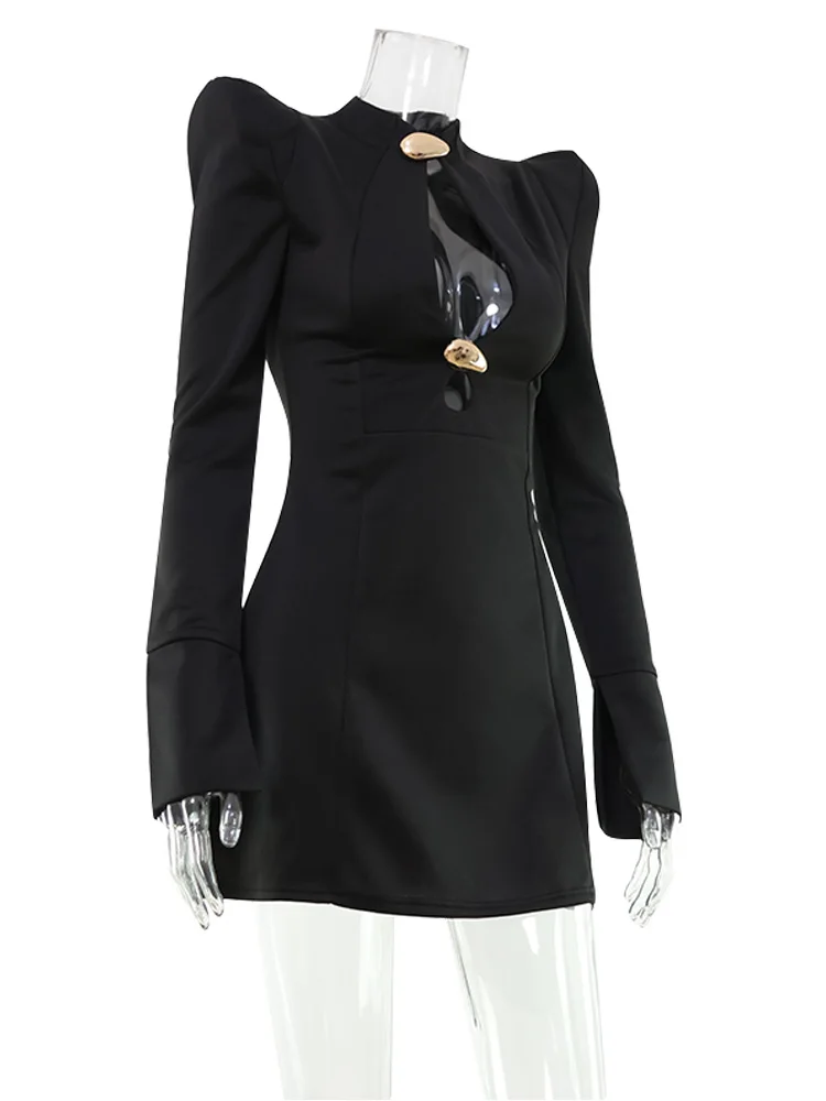 Turn heads this season with this metal buckle hollow out bodycon dress for women, designed for autumn fashion. Featuring a solid color, chic O-neck, long sleeves, and a flattering sheath silhouette, this sexy club dress enhances curves while keeping a sleek, modern look. Perfect for nightlife, parties, and statement streetwear outfits.