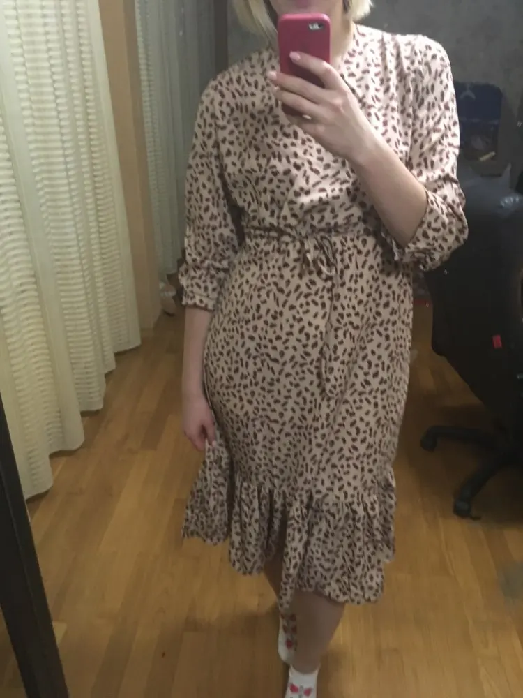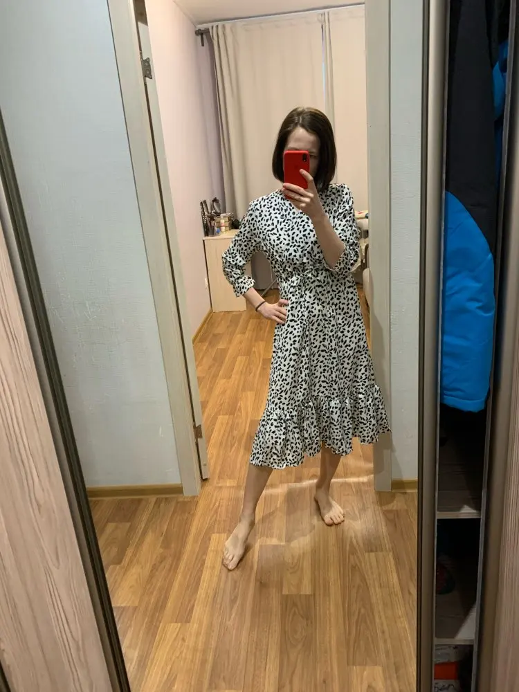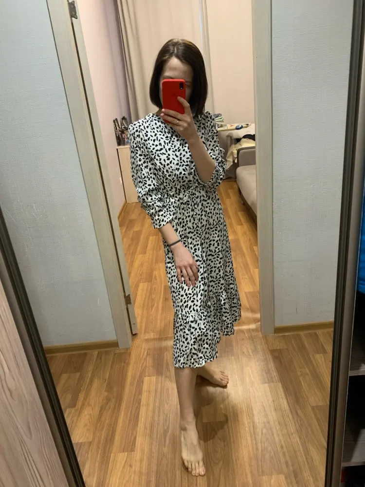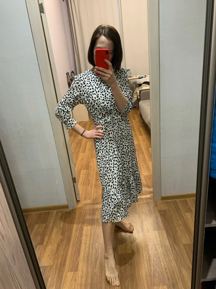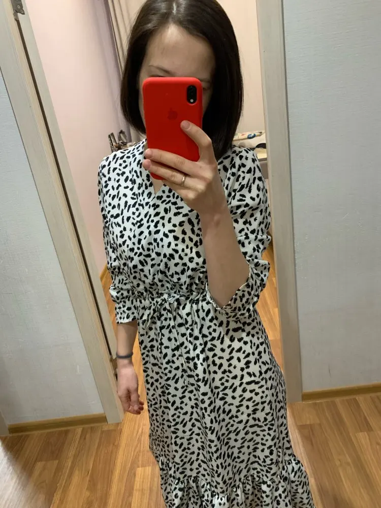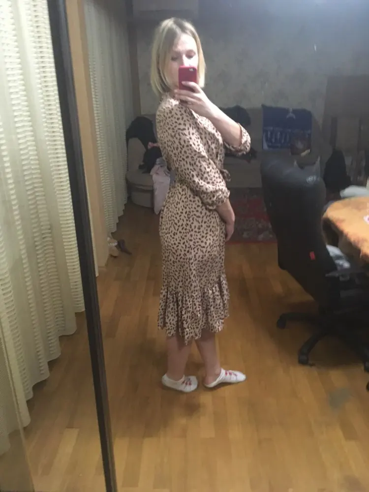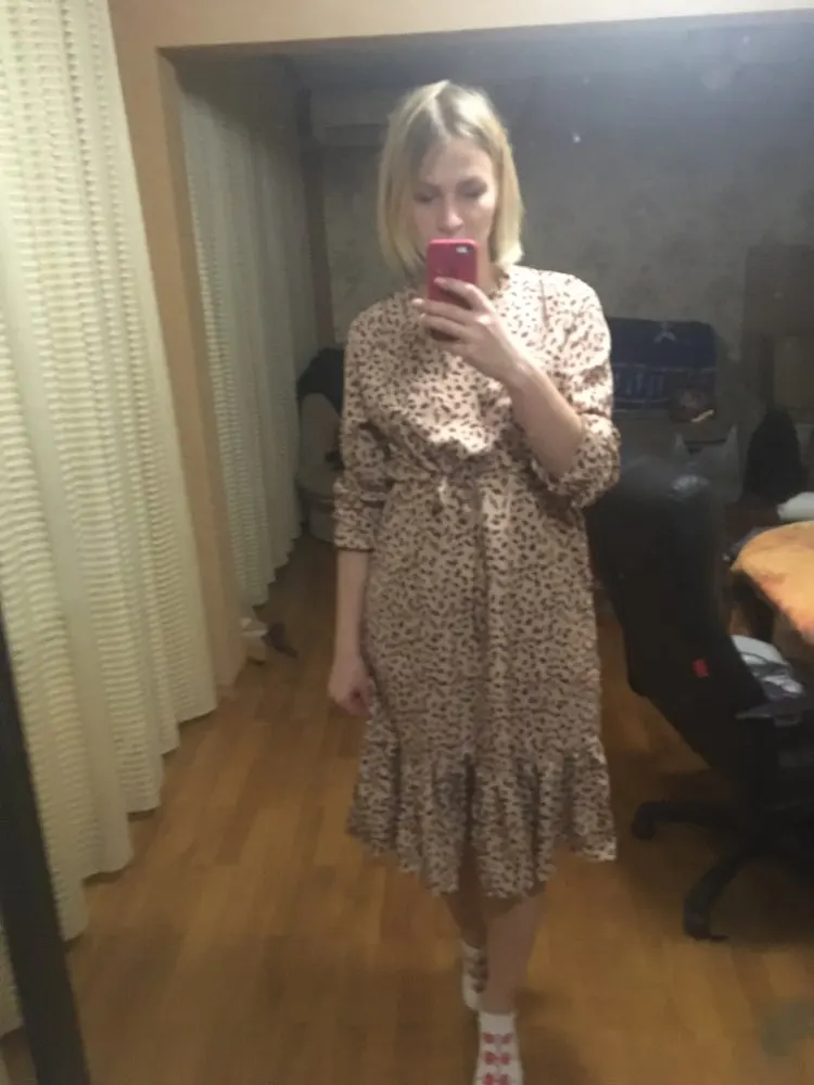 The dress came quickly enough of all the goods. Not "stuck" in a new year with quarantine. The quality of tailoring-in the usual fun)), a little uncomfortable put on. The price is pleasant, when it is worn-no jambs can be seen, it looks good, it depends on the figure, but it does not look cheap. The waist is overstated, almost under the breast, it can not be changed by any belt, etc. The sleeve is shortened. The dress itself is normal in length. Very strongly elecrisis, it is impossible to remove from pantyhose. I'll try to wash, antistatic may help. The photo shows-the bottom of the dress between the legs. Size. I wear M, 36-38, 44-46. My parameters are 92-76-95. Height 168. This dress bought L. I will say for sure-less can not be. On the shoulders and in the chest sits clearly. The picture is pleasant, the speckled is not white, but beige, for the blond is good. In general, you can wear for a change.