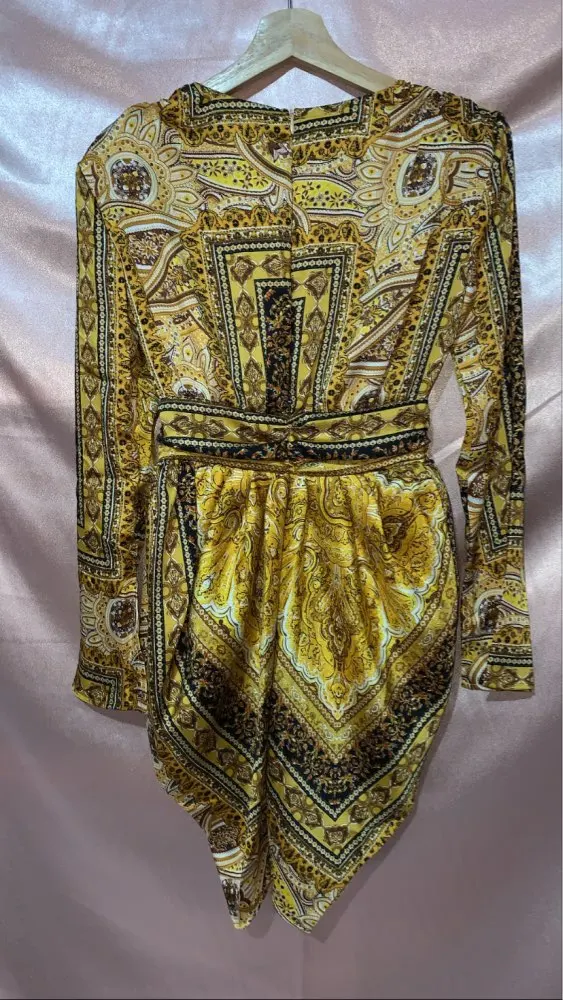 Mini Dress Yellow Vintage Print Deep V-Neck High Waist Sleeve Split Shrug