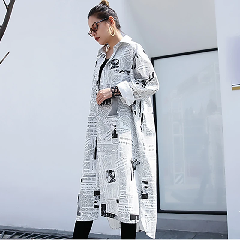 New Spring Autumn Long Shirt Women White News Paper Latter Printed Big Size JKP3878