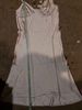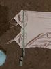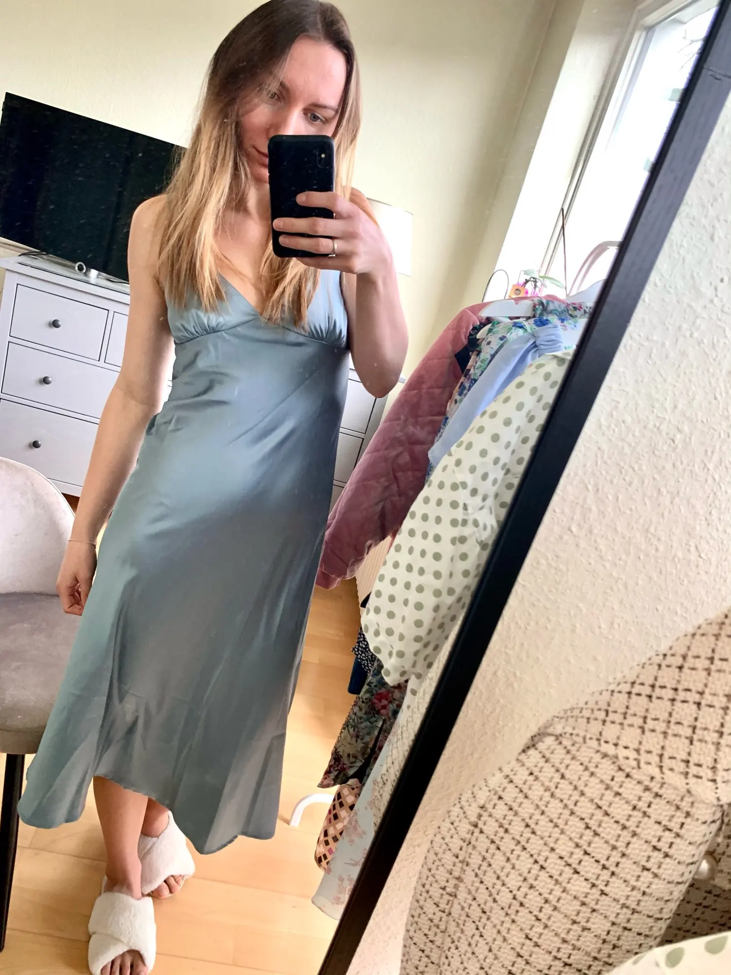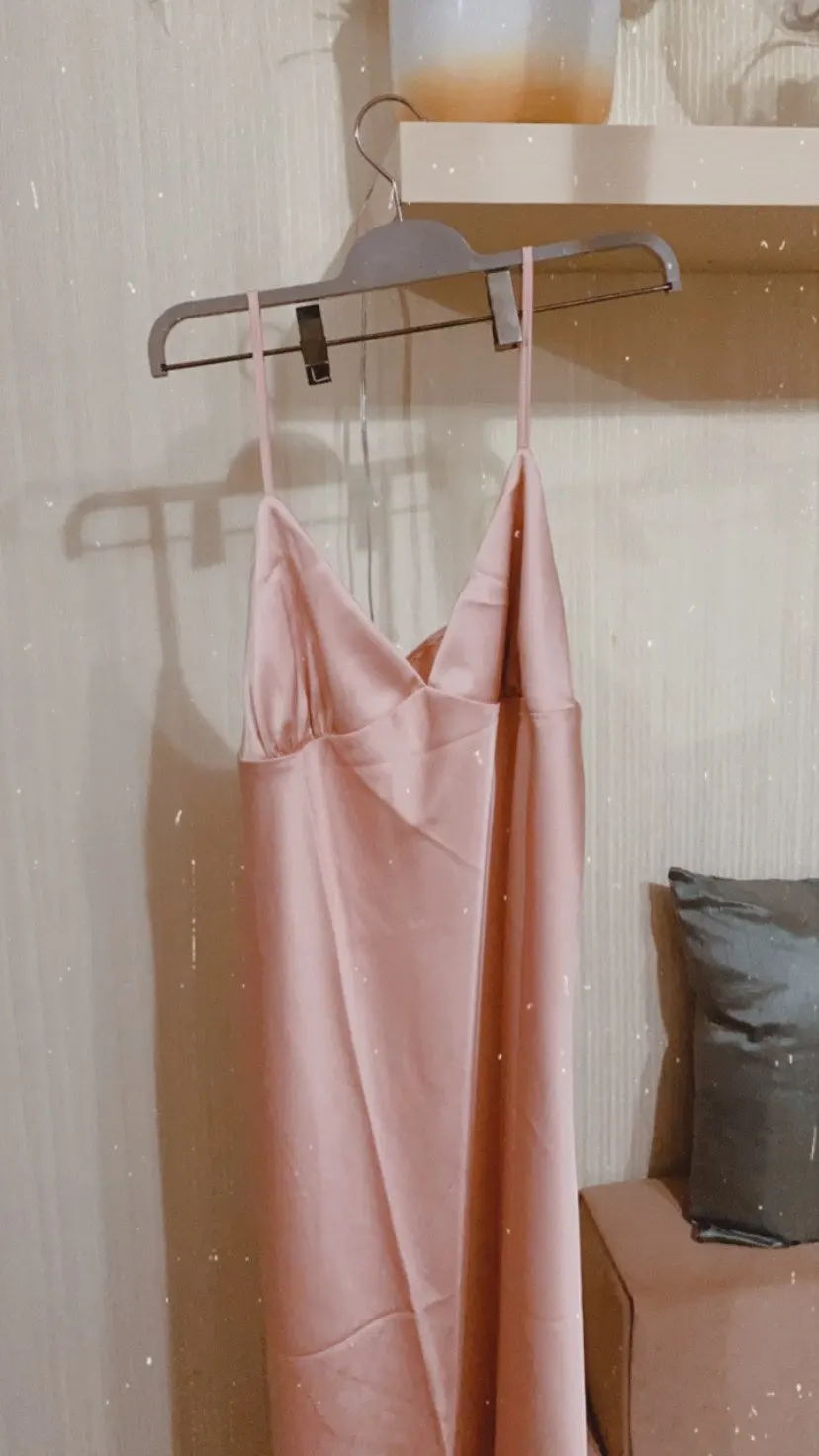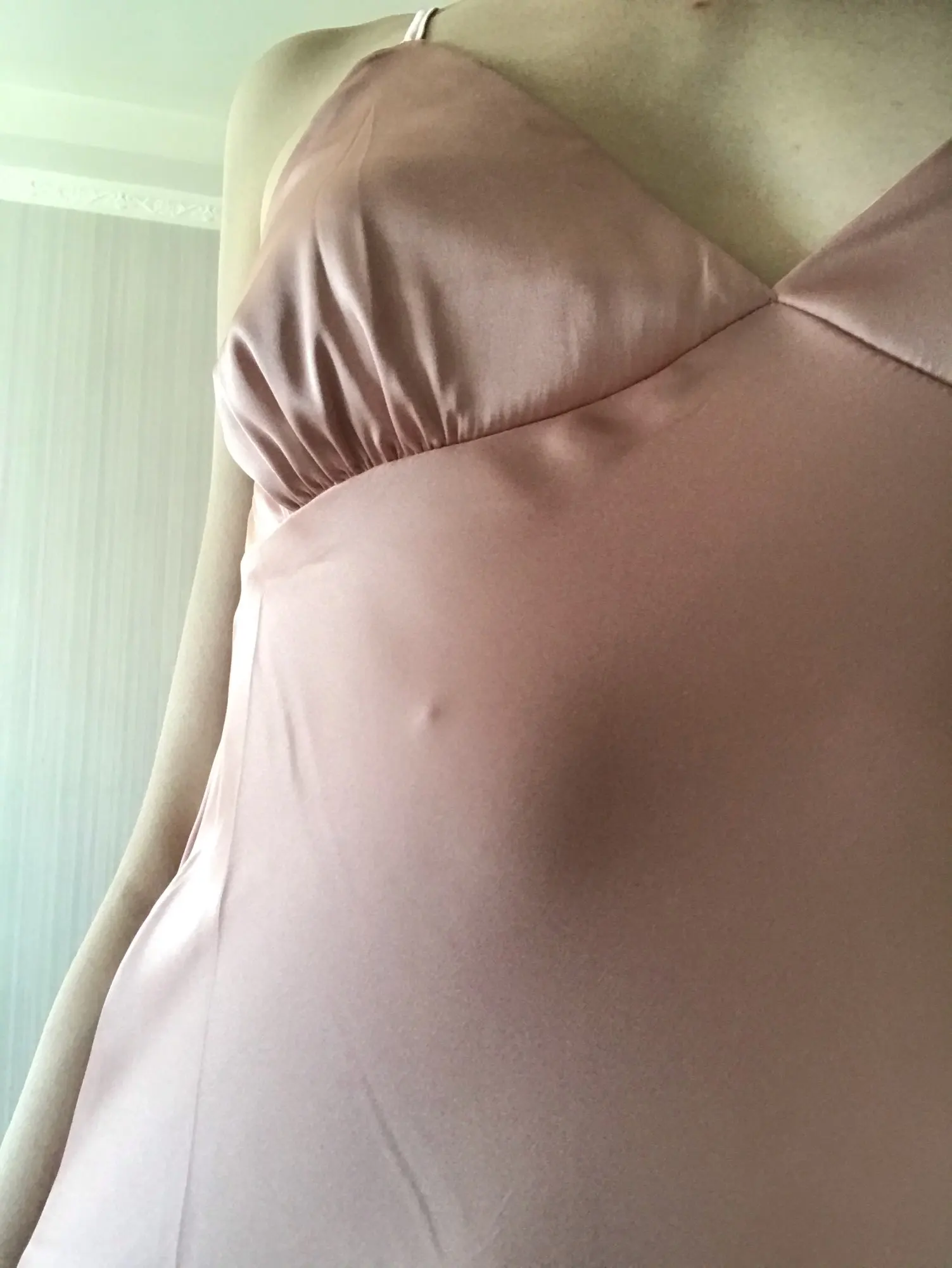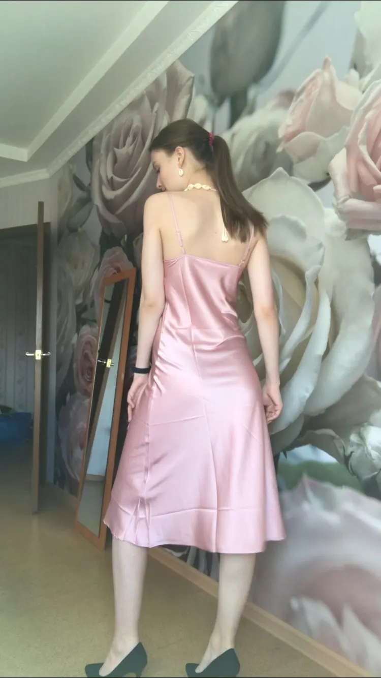 Very beautiful and pleasant dress, both dressed and do not want to shoot, even at night)) The fabric is shiny with matte mother of pearl, very beautiful. The thread does not stick out. It stretches a little. It does not crumple much, but it gets dirty easily. Even a drop of simple water leaves stains, you need to be neat. Rings on straps are plastic. The tummy, unfortunately, with this dress is not compatible, it will have to somehow pull. In general, given the price, I recommend buying a couple at once, different colors, you will not regret it.