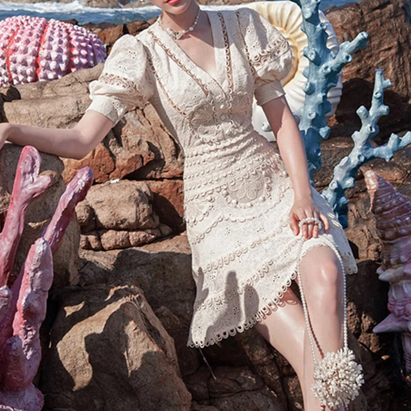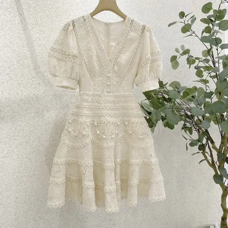 New Vintage Embroidery Lace Elegant Mini Dress High Waist Bodycon JKP4839