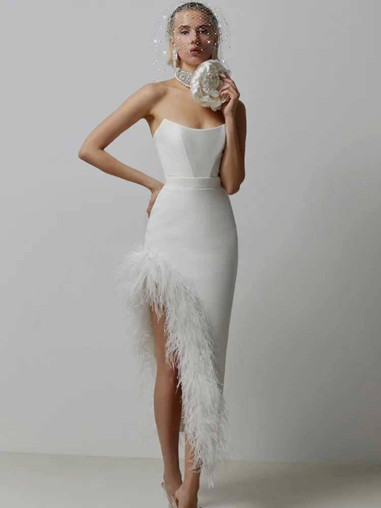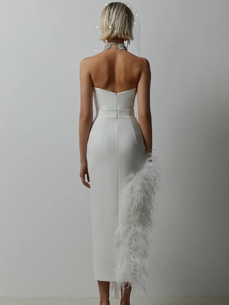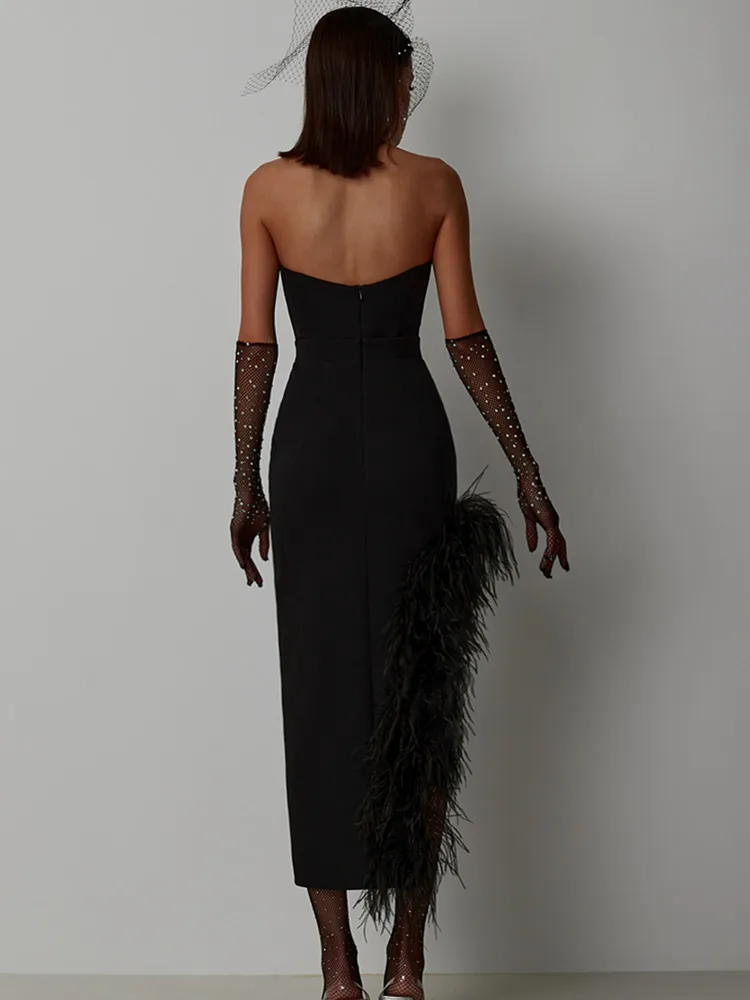 New Women Evening Bodycon Party Dress Strapless Black White Feather Midi Bandage Dress Split Knitted Elegant JKP7176