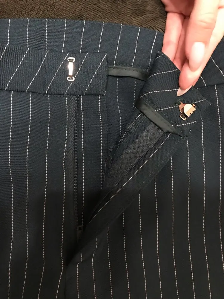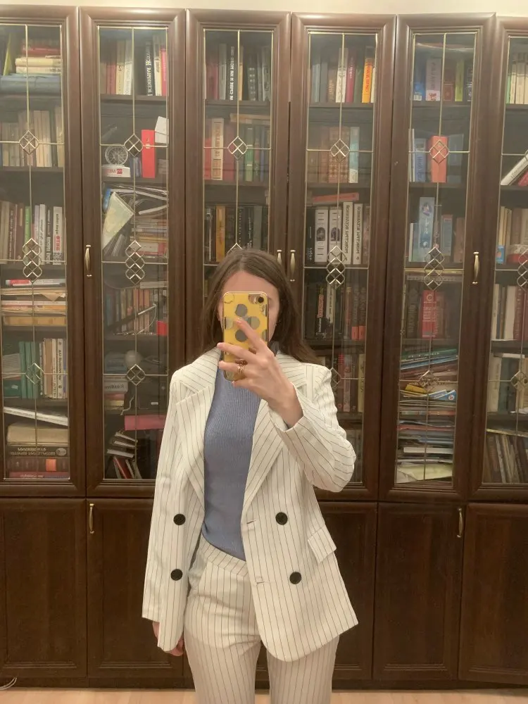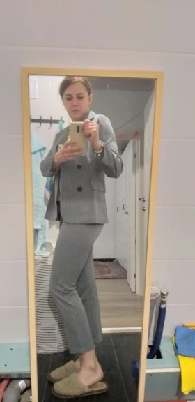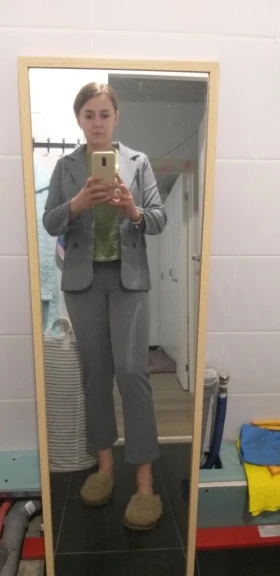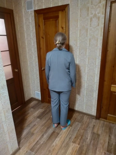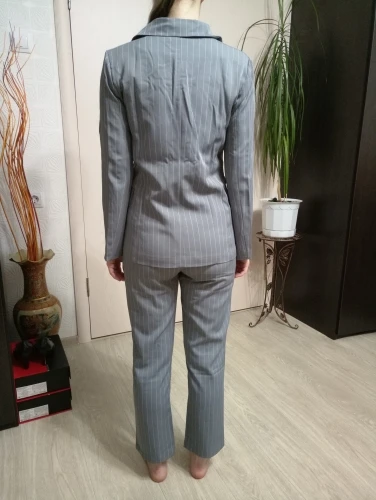 Great suit. Sews very well, looks expensive and presentable. Pants are straight, not narrowed, for a height of 168 cm moderately shortened. On my 93/76/95 Russian 46, the size L sat down as poured.