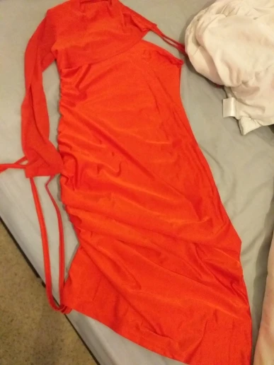 Beautiful dress. I have a size L taken. The strings are there long but can you attract and the desired length creëeren. The sleeve is translucent and of any other substance as the rest of the dress. Everything is stretch fabric.