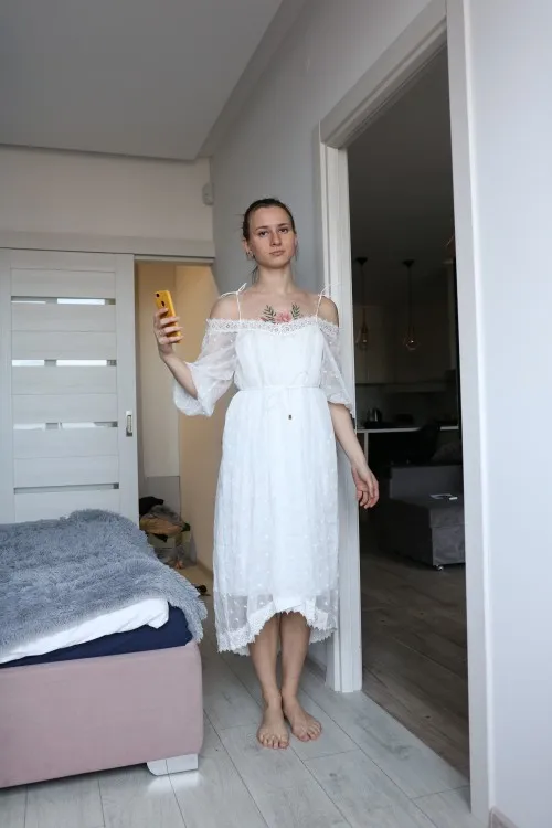 Cute, smart dress. There are no flaws, all qualitatively. The dress came in the stated terms. I took it with the expectation of the sea promenade.