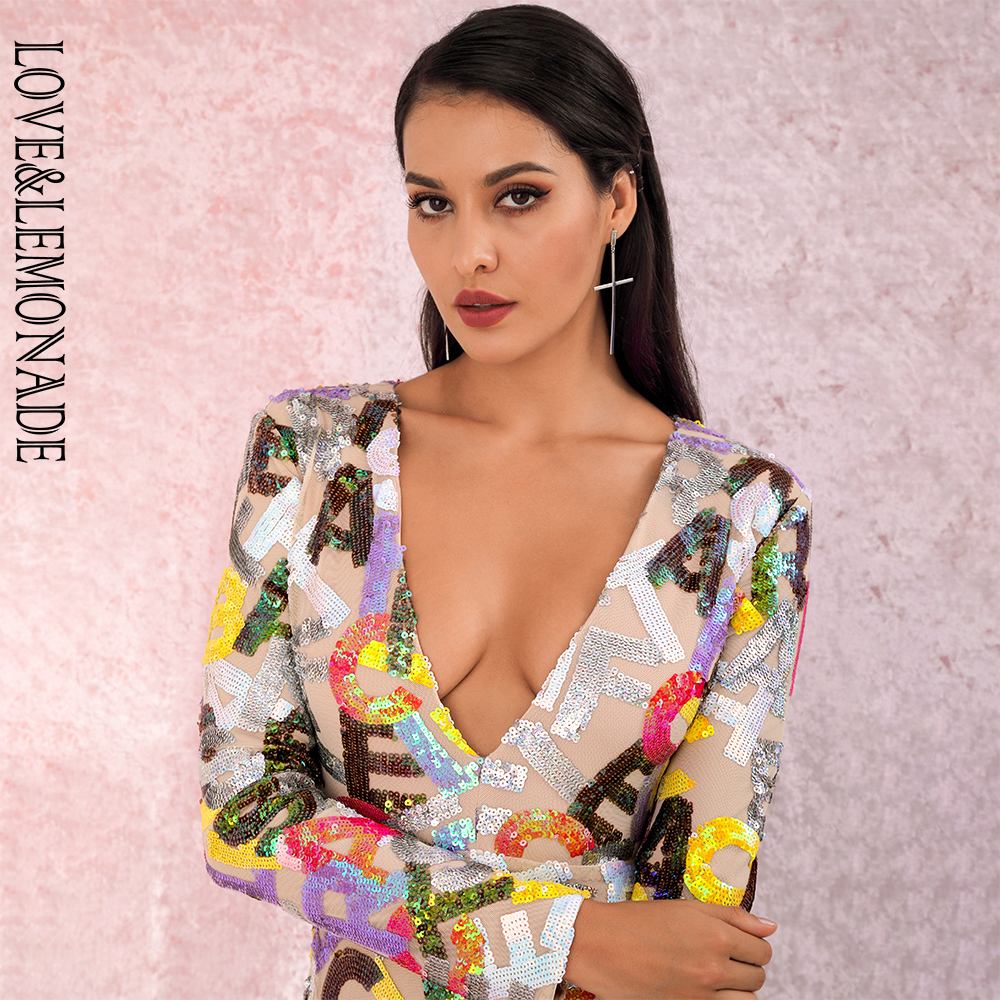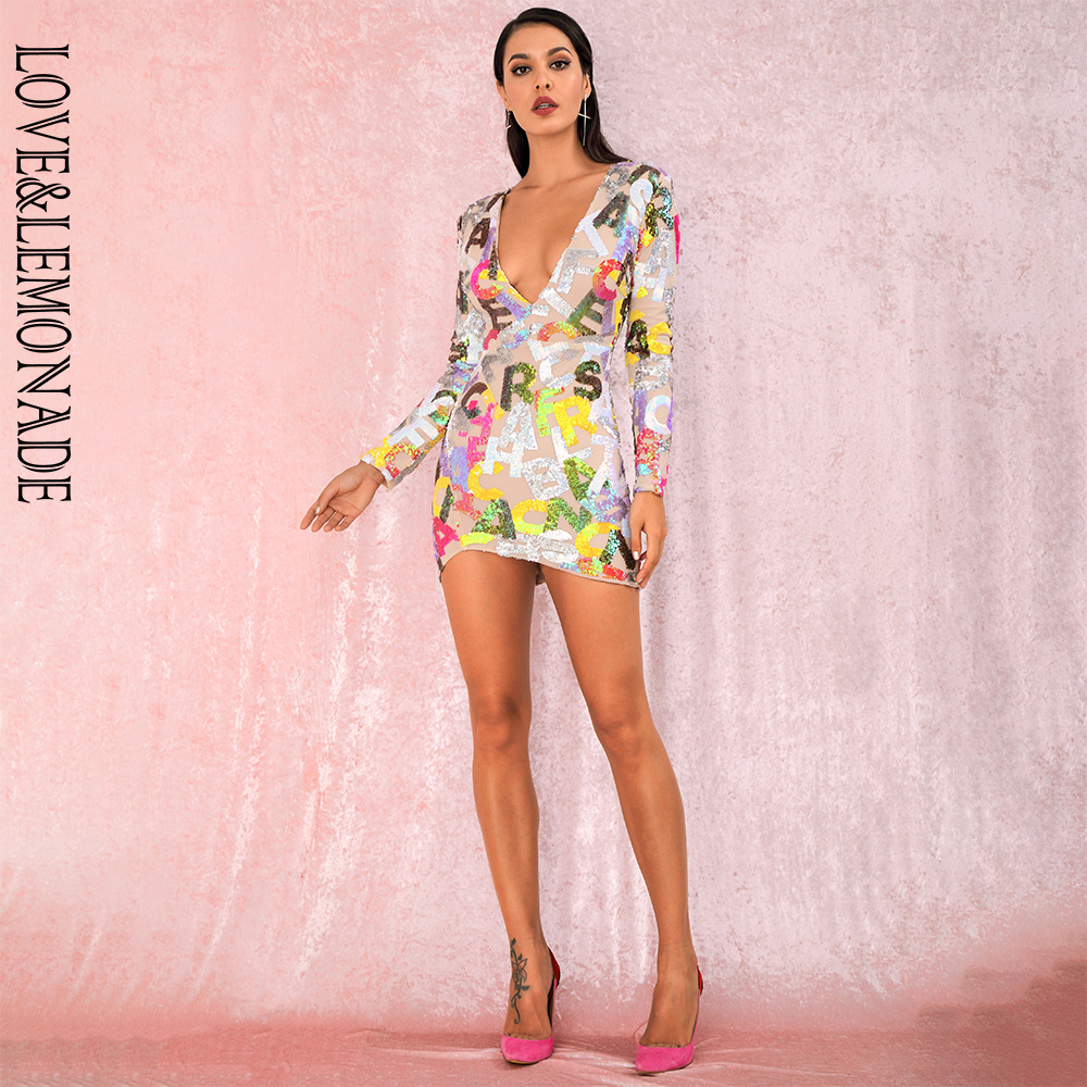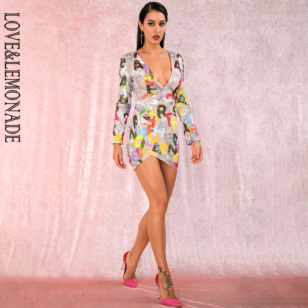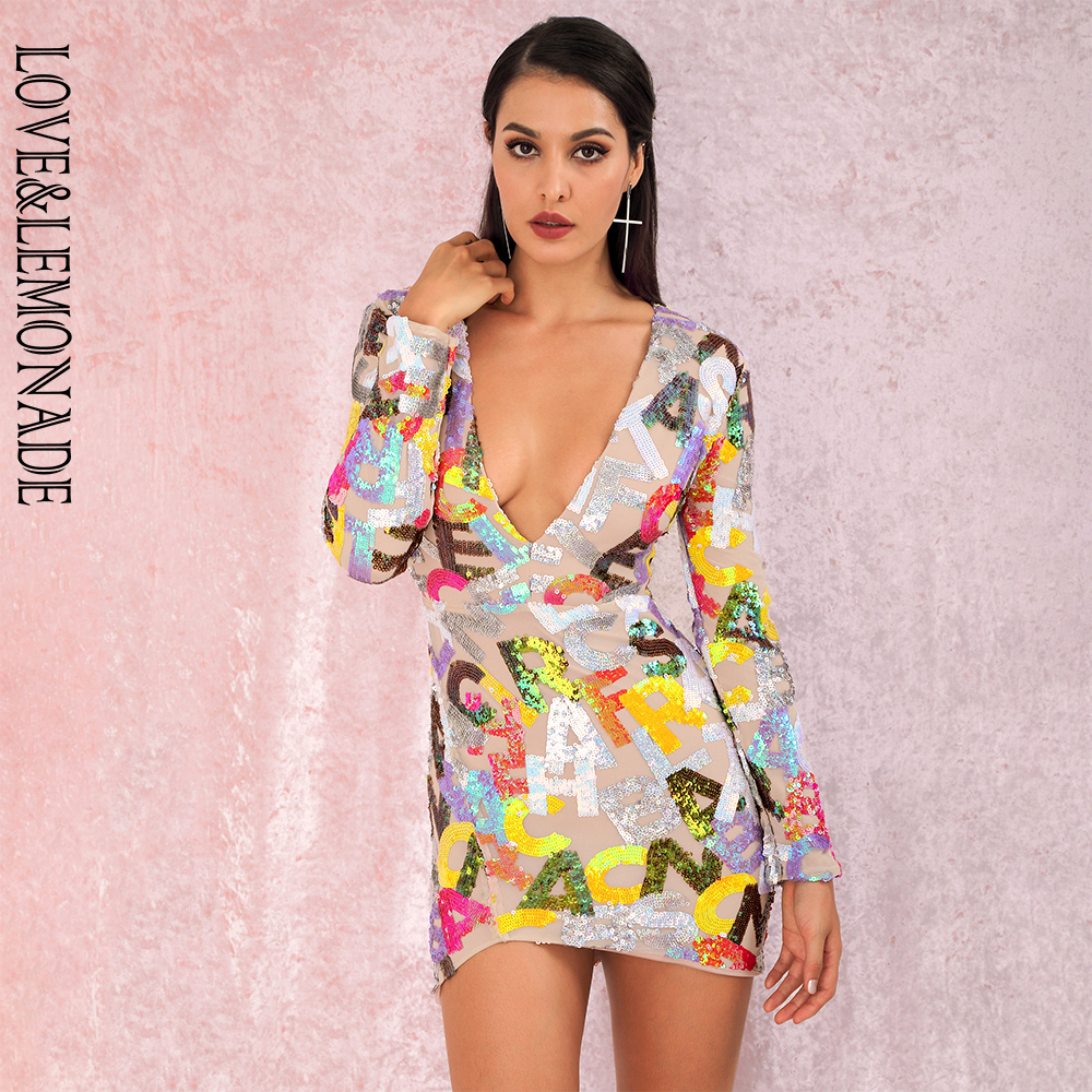 Party Mini Dress Deep V Neck Cut Out Letter Sequins Bodycon Long sleeved