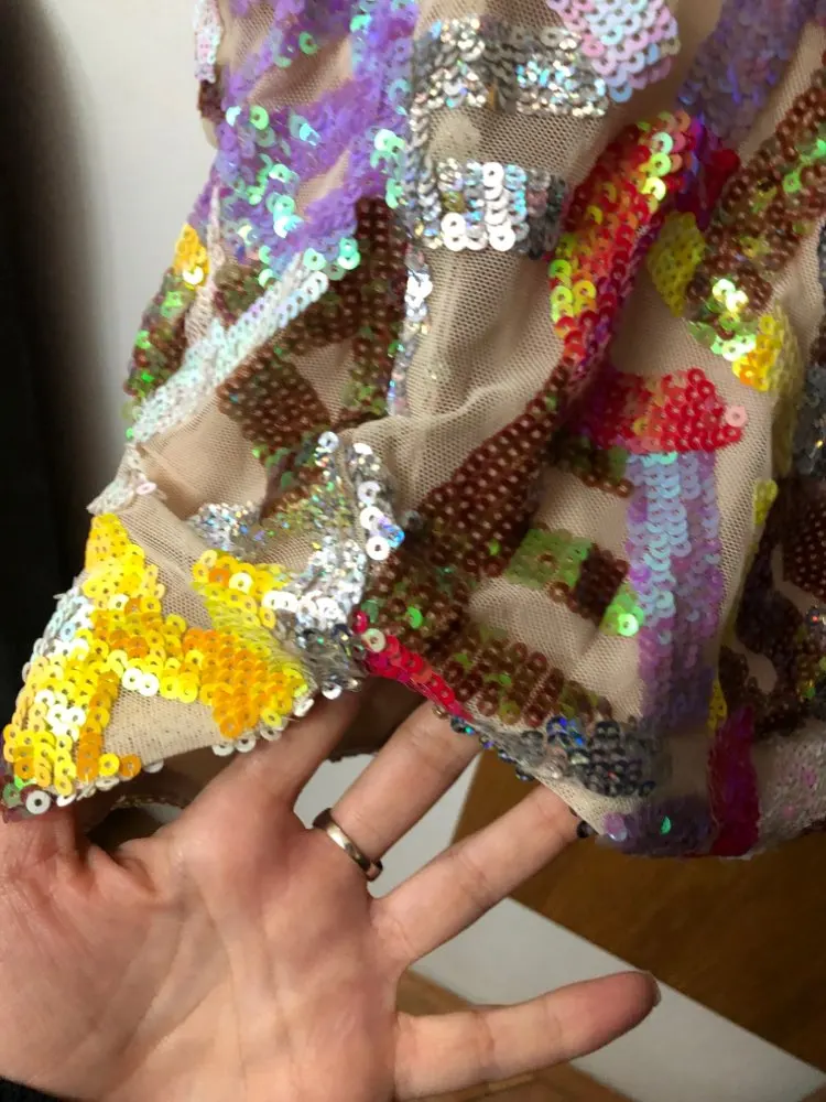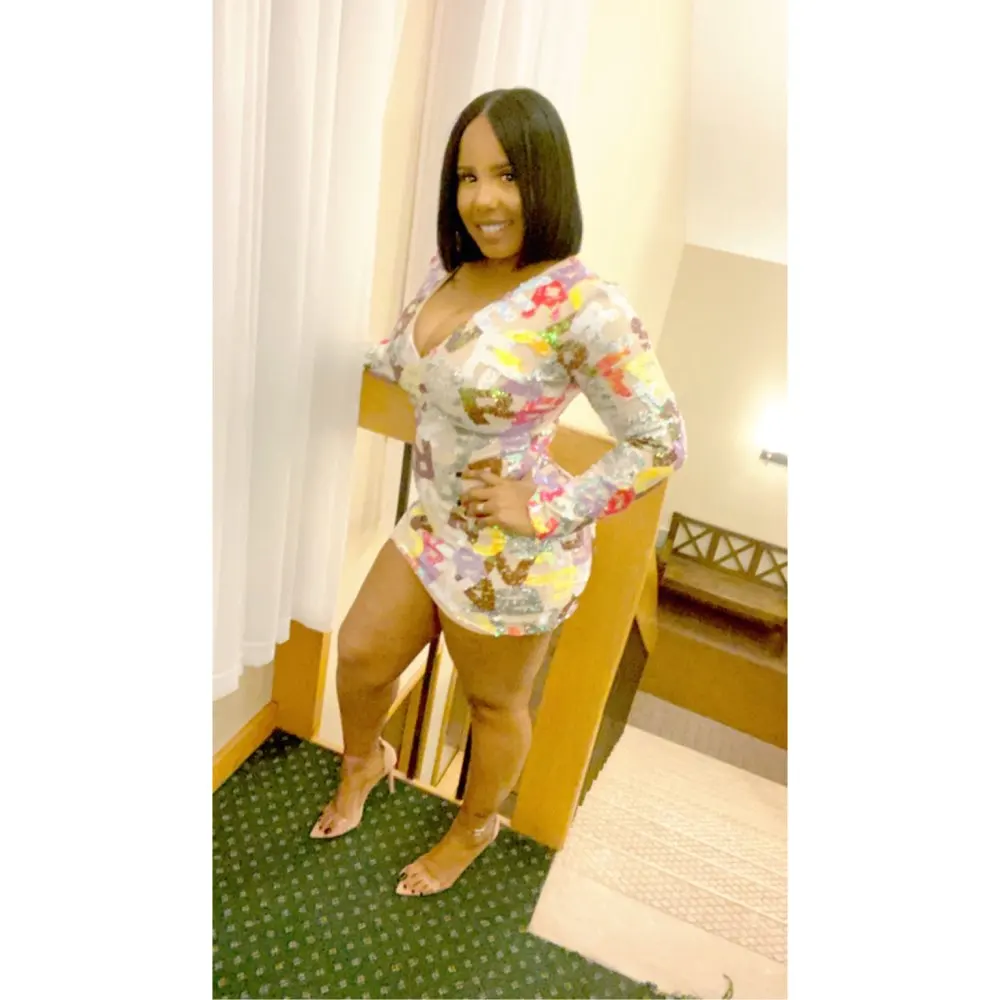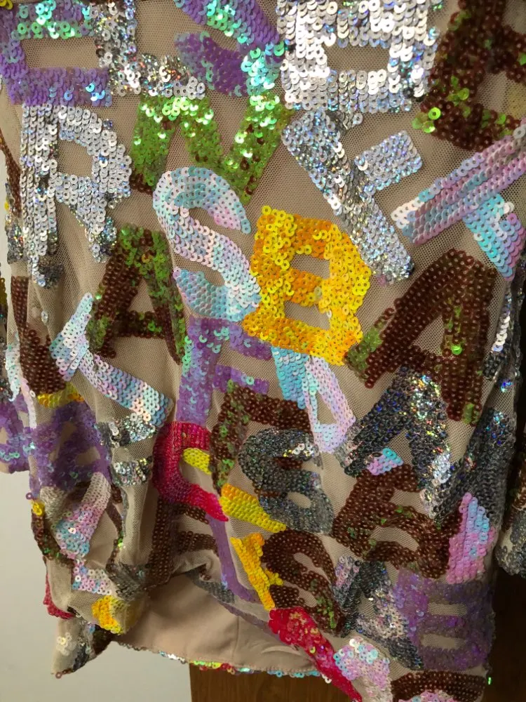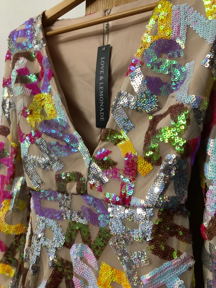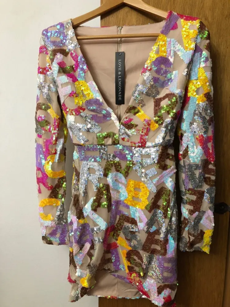 Party Mini Dress Deep V Neck Cut Out Letter Sequins Bodycon Long sleeved