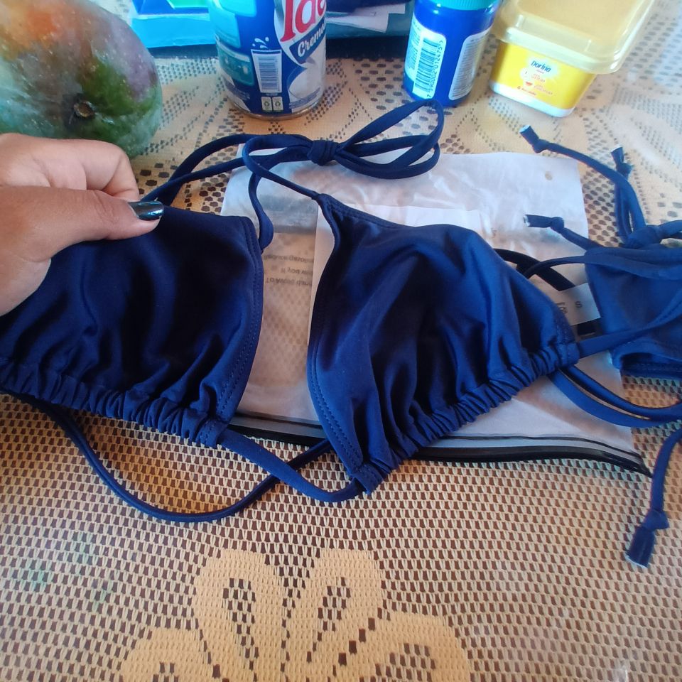 The color is nice, the fabric too, the material looks good and comfortable. It comes with its lining and the cups of the bra can be removed. The only thing that would be great is if the ends of the strings are sewn or have some finishing.