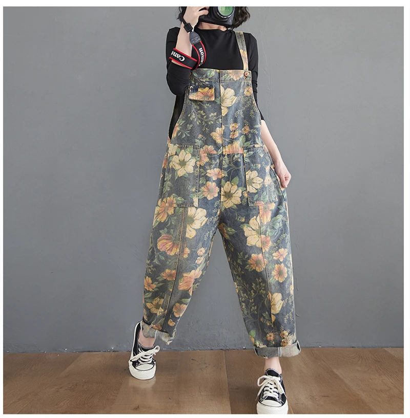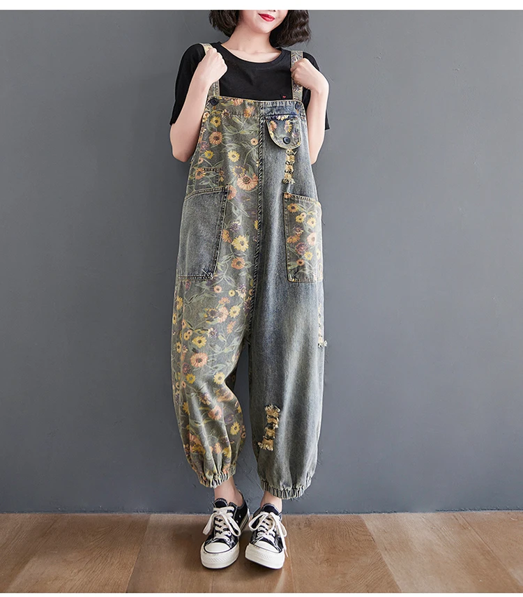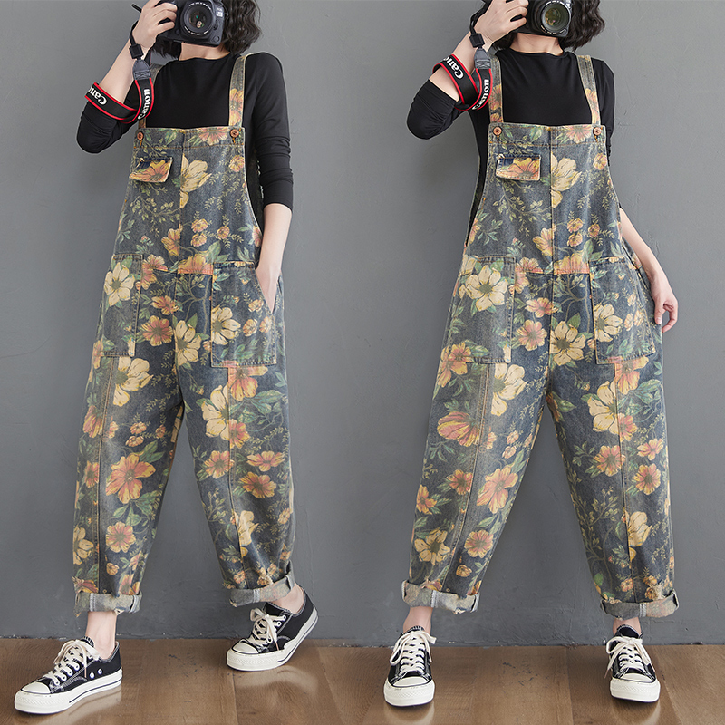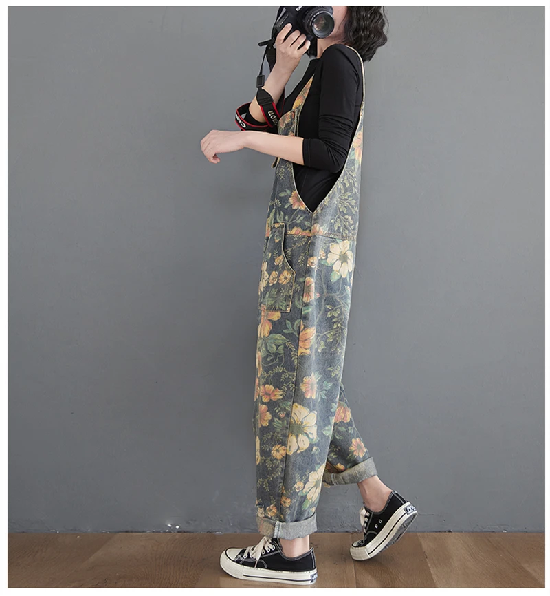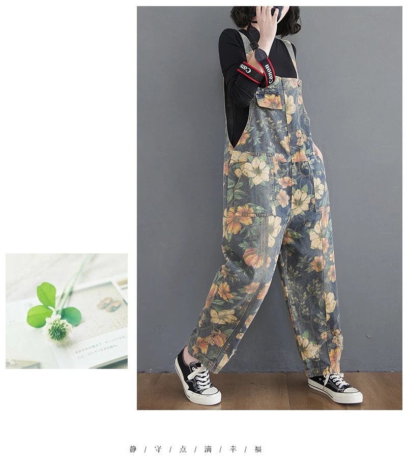 Plus Size Casual Loose Denim Jumpsuit for Women Floral Print Wide Leg Overalls for Spring and Autumn JKP7228