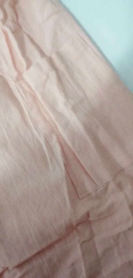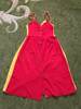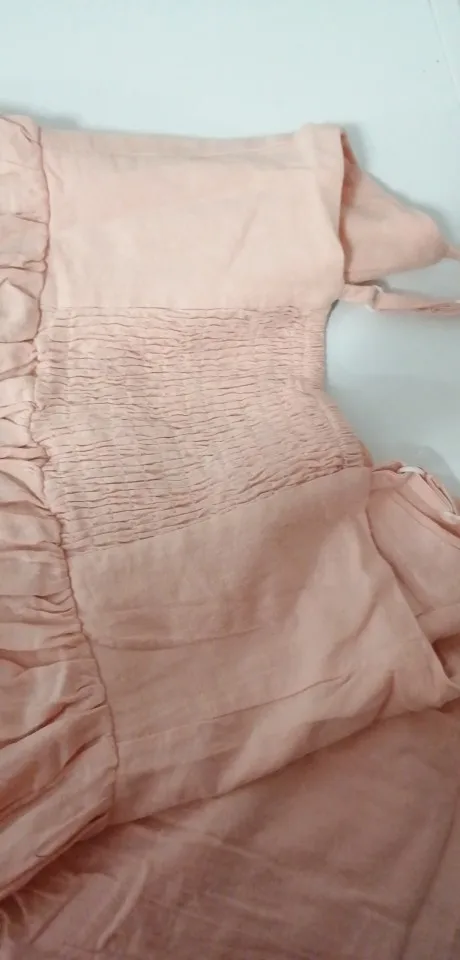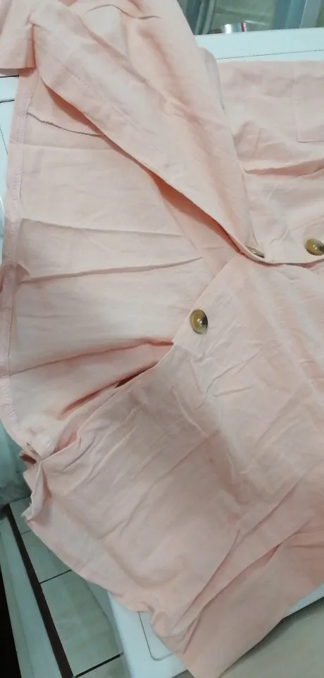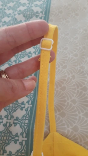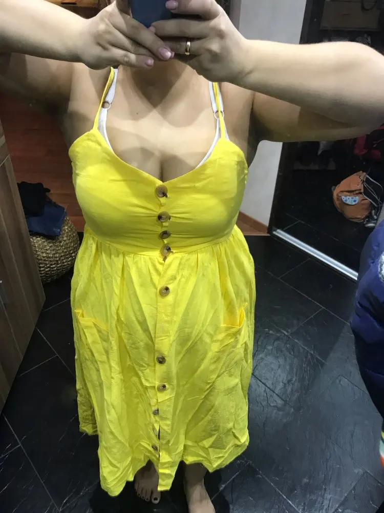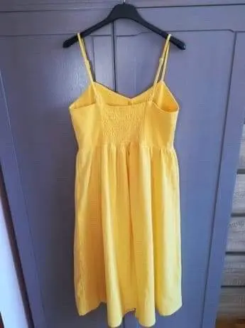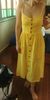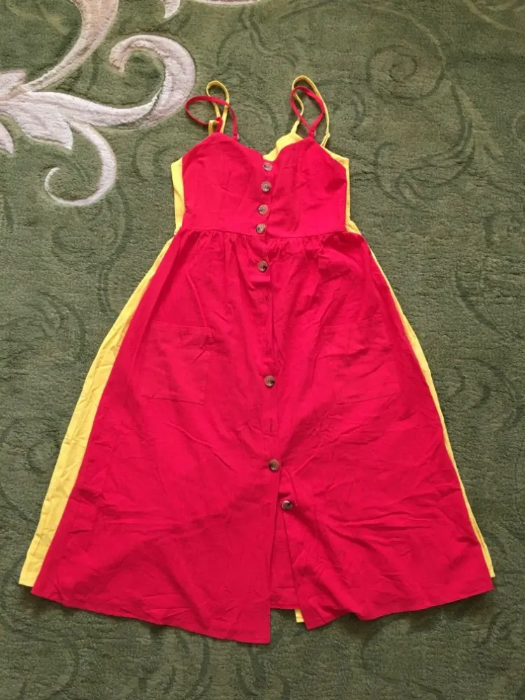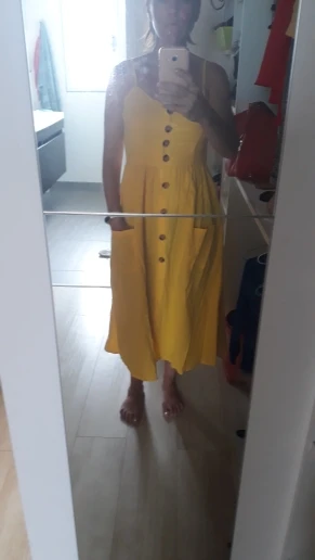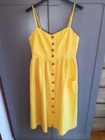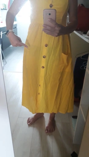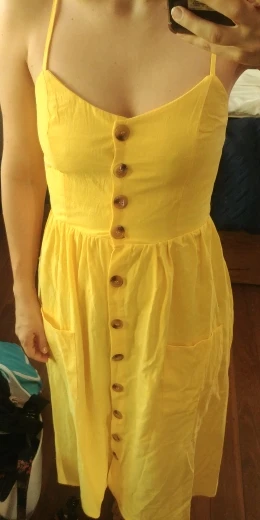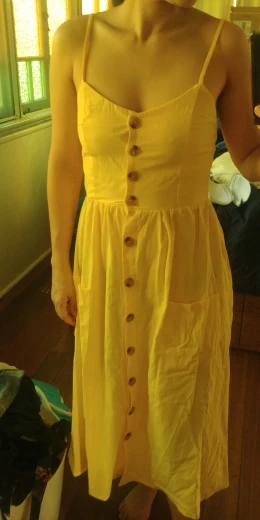 As described, good quality buttons & straps sewn well & in the right place. Bottom skirt part is unlined so recommended to wear lighter underwear as dark you can just see. Beautiful yellow colour will look great once ironed. Took bit over a month to get to Australia.
