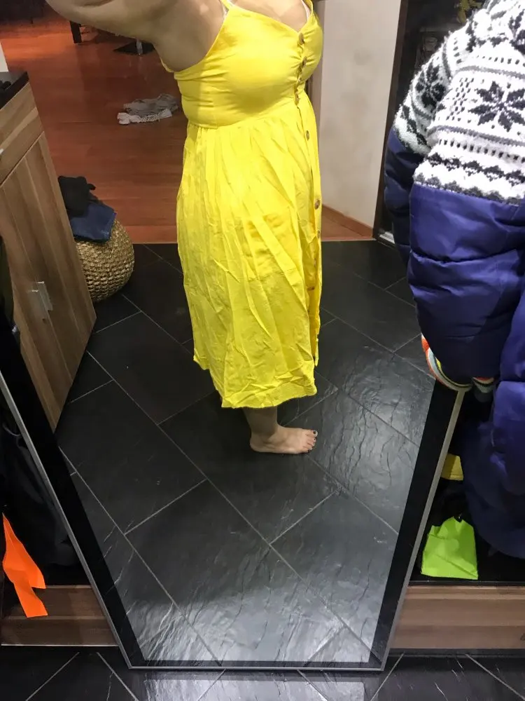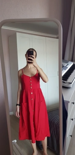 Sundress Super! Everything corresponds to the description of the store: color, style, material. Pleasant fabric, straps are adjustable, on the back of the elastic band, two pockets. At a height of 176 the length is slightly below the knee. Or parameters 89/72/94. I took two sundresses: red and yellow, both size M, so the red color sundress is smaller than yellow, in the chest, at the waist presses, yellow-excellent!