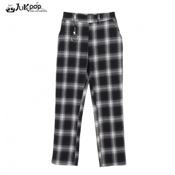 FREE SHIPPING Women Pants Side Slit Ring Plaid Pants JKP1153