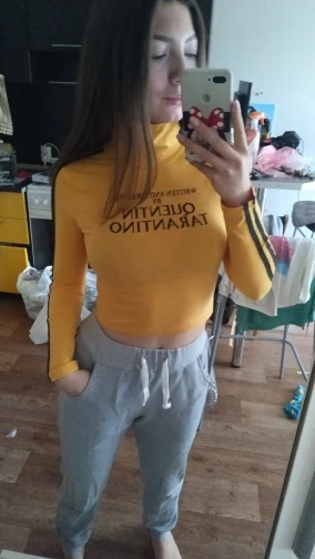 Cool top. Very qualitatively made. OHG 96, growth of 176. The size m is too stuck, I had to take L. It's a little glowing, underwear needs bodily. Length as in the photo. Looks stylish. It's been a month.
