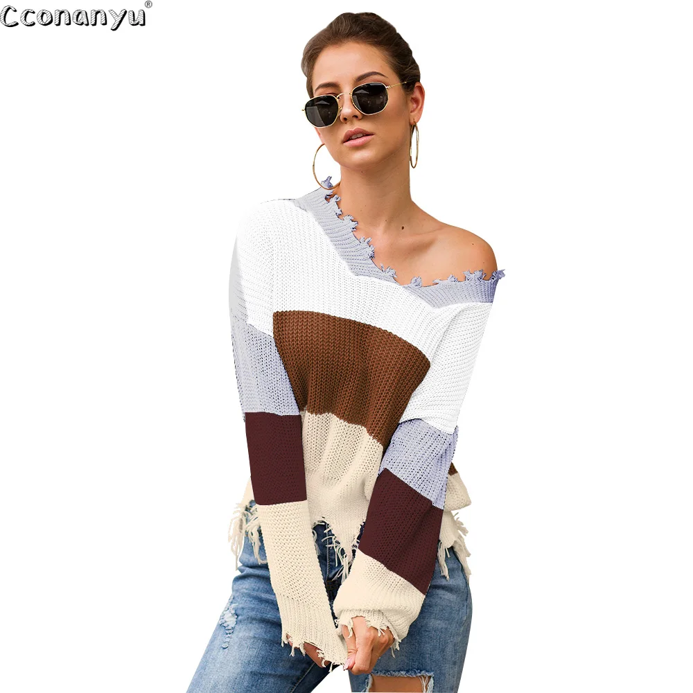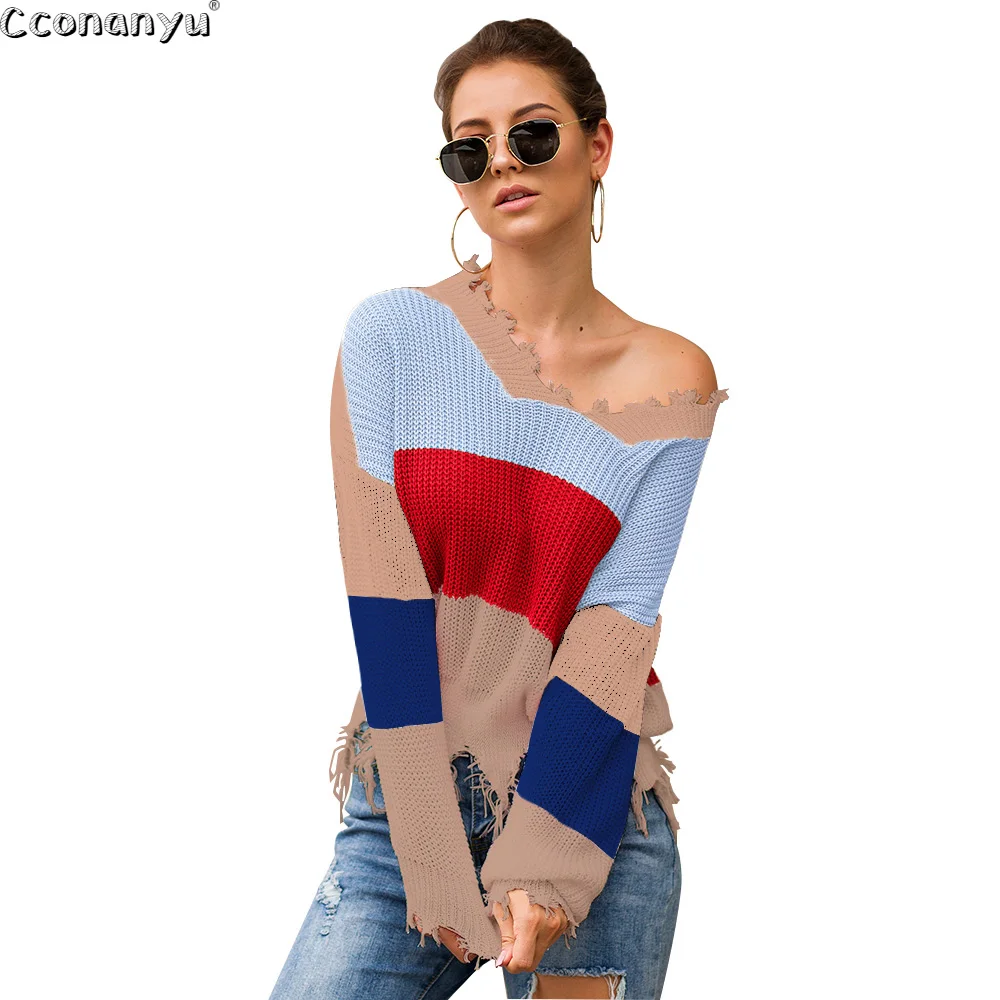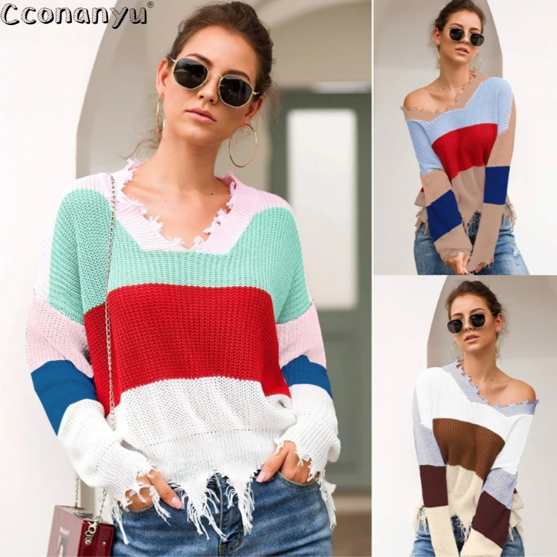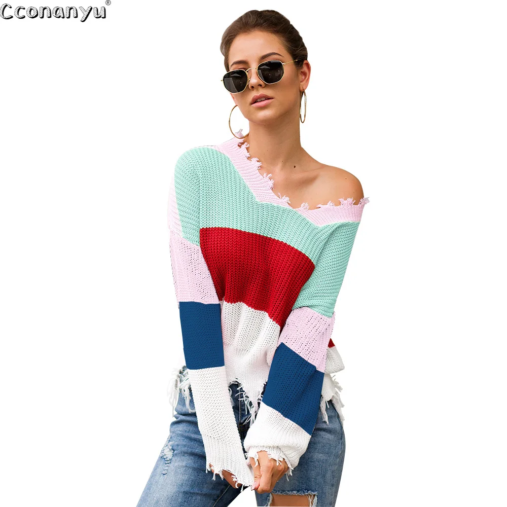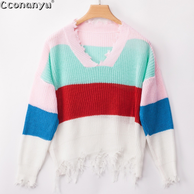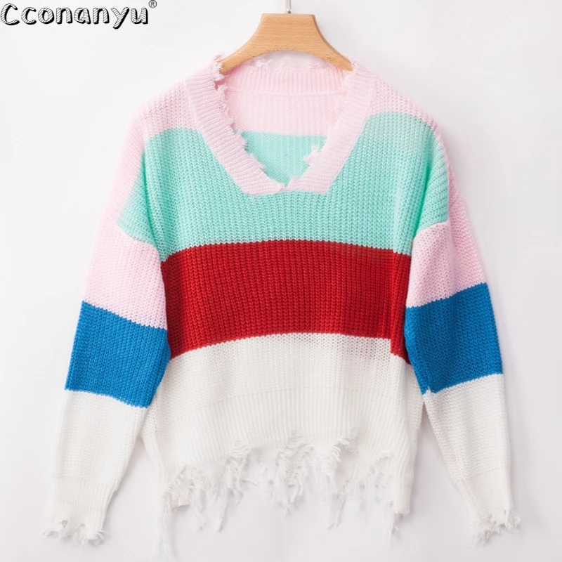 Rainbow Knitted Sweater Ribbed Winter Outfit