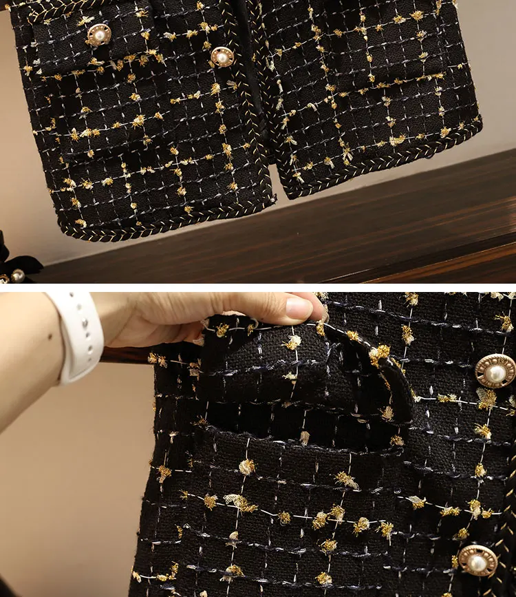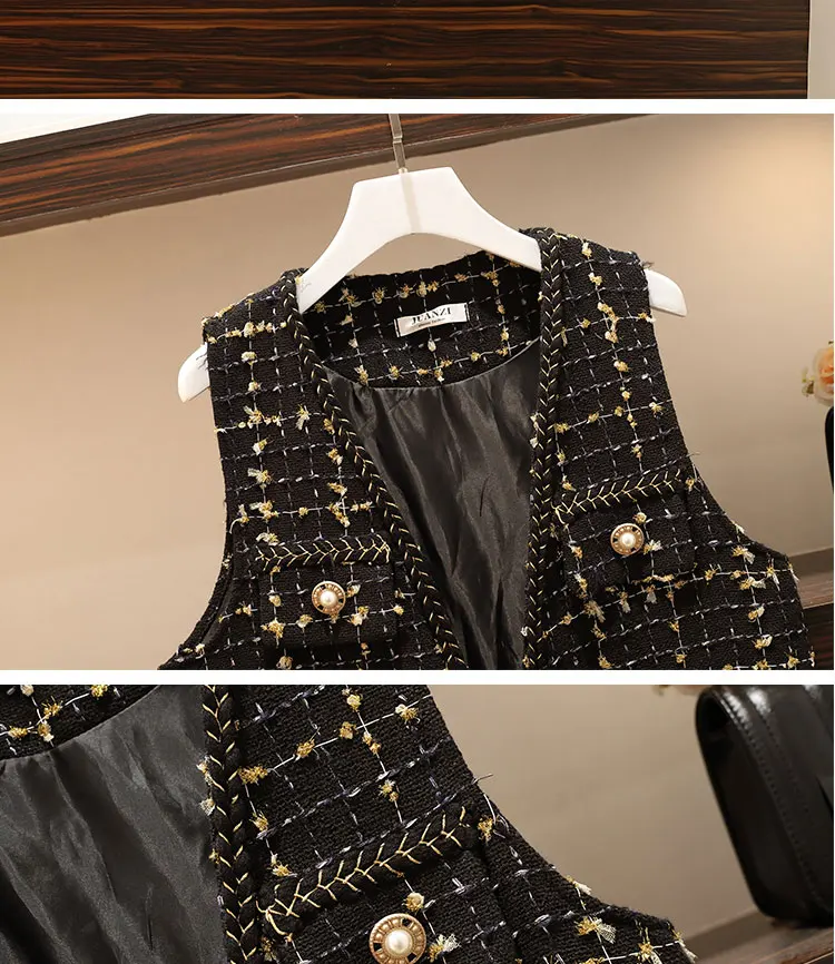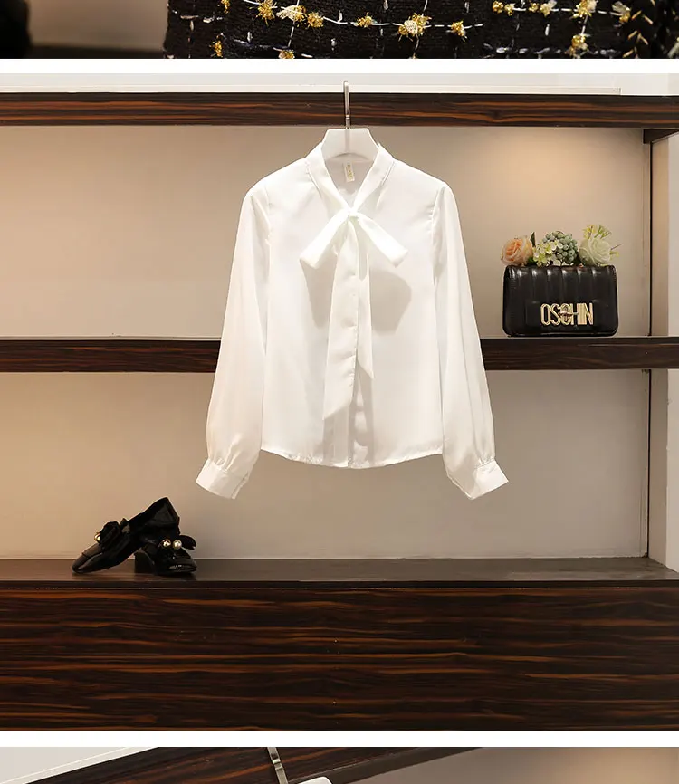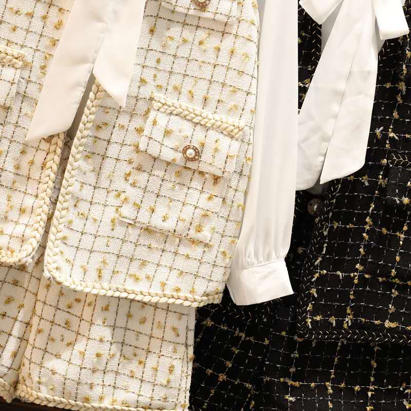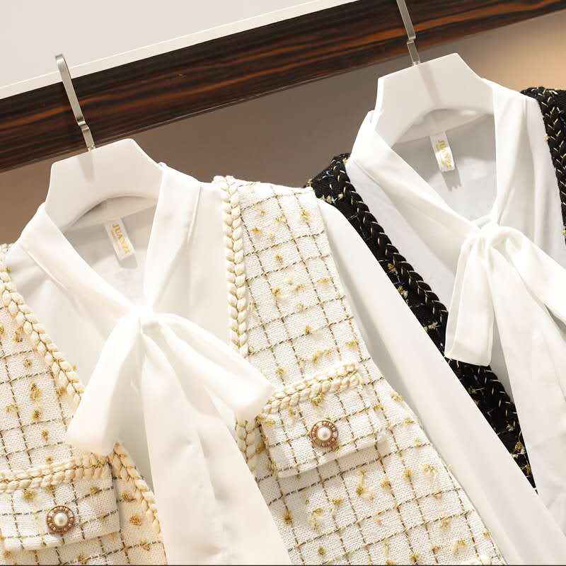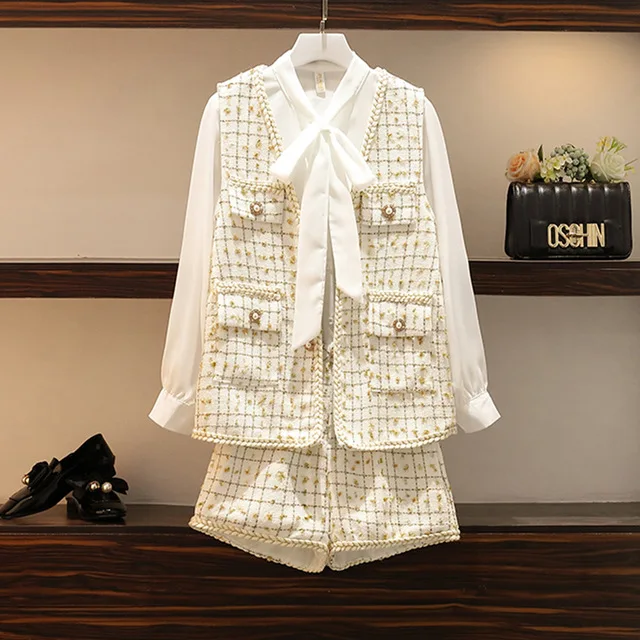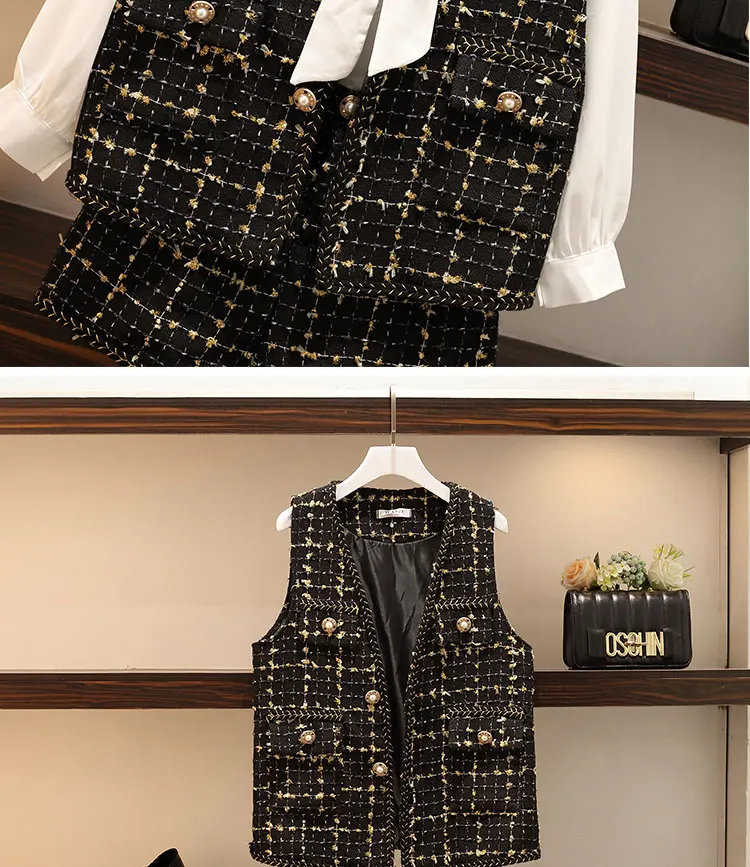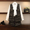 SALE Tweed 3 Piece set Women Chiffon Bow Collar Shirt + Single-Breasted Plaid Vest + Shorts Outfits JKP5879