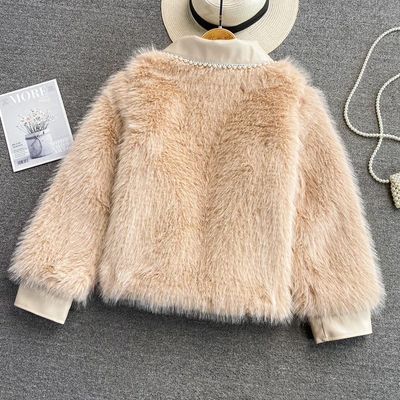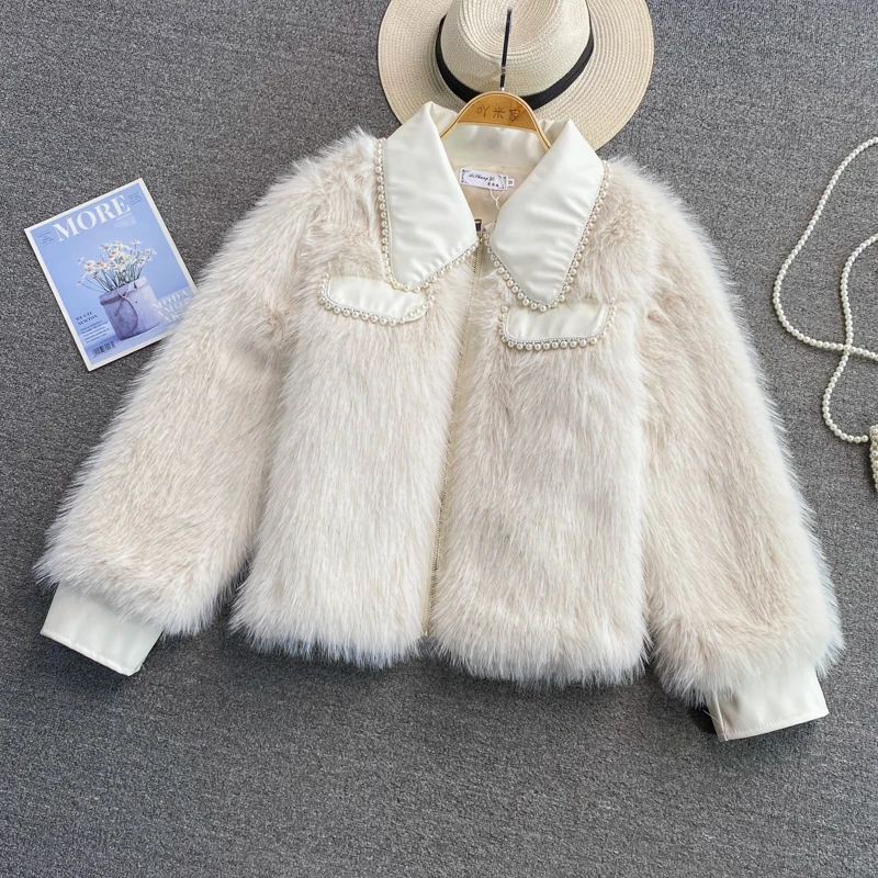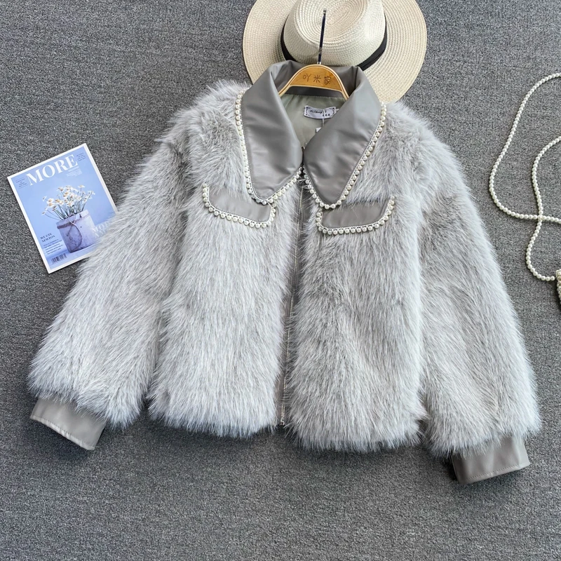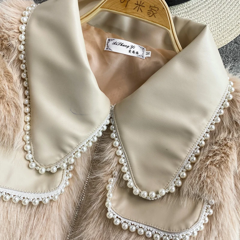 SALE Winter Coat Thick Fox Fur Wind Pearl Beaded Lapel JKP4850
