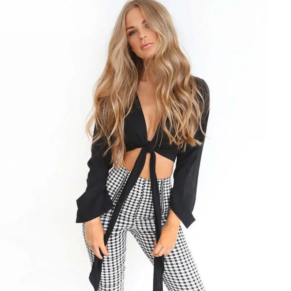 Sexy Women V- Neck Long Flare Sleeve Bow Tie Bandage Tee Top JKP4301