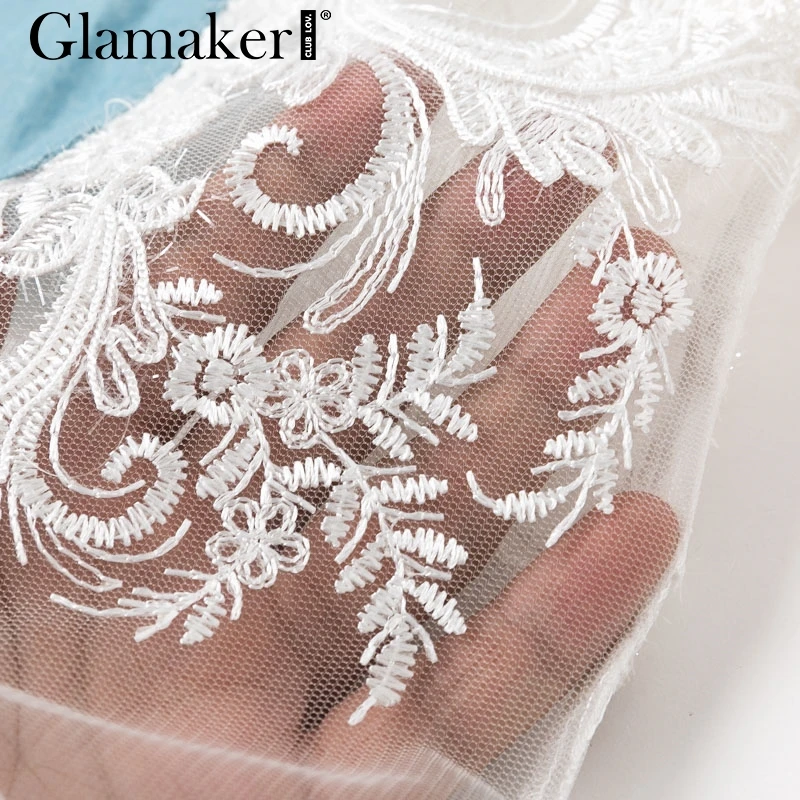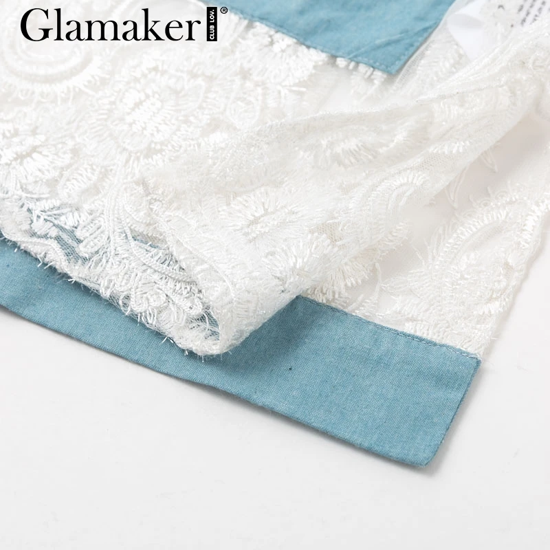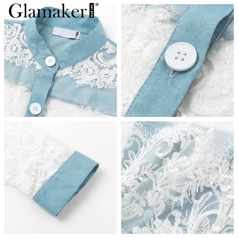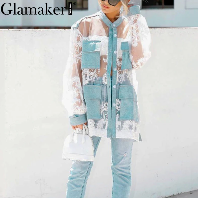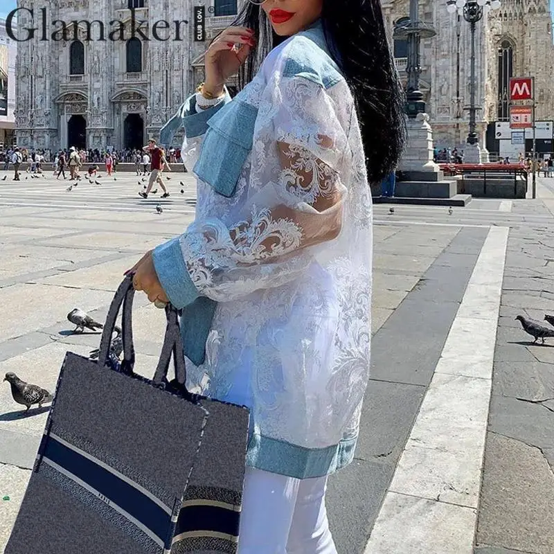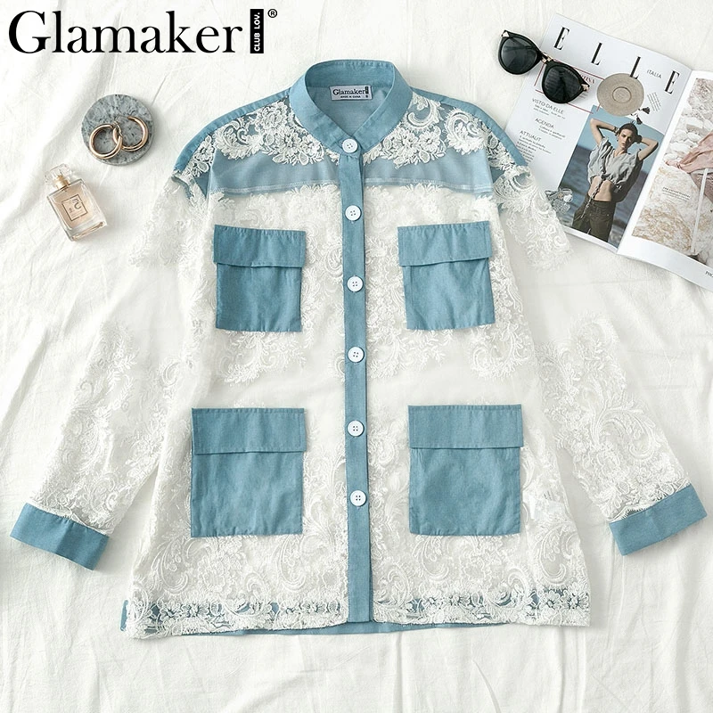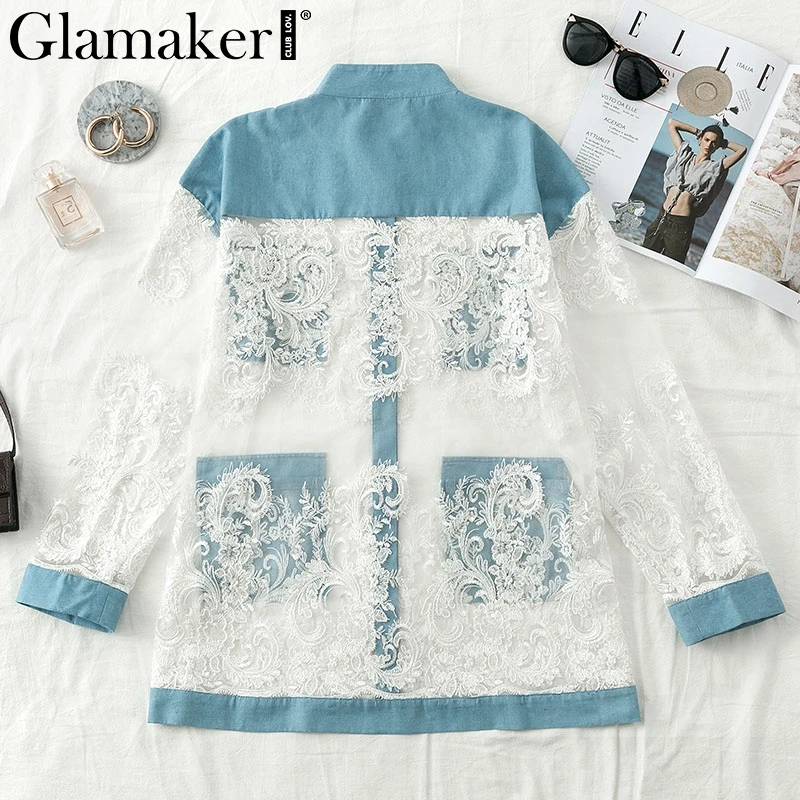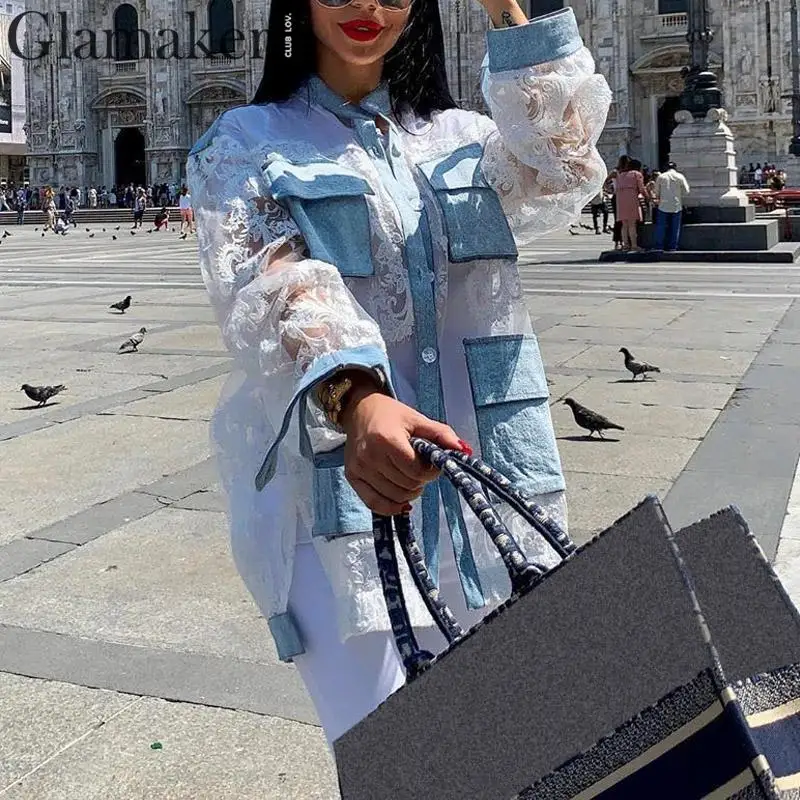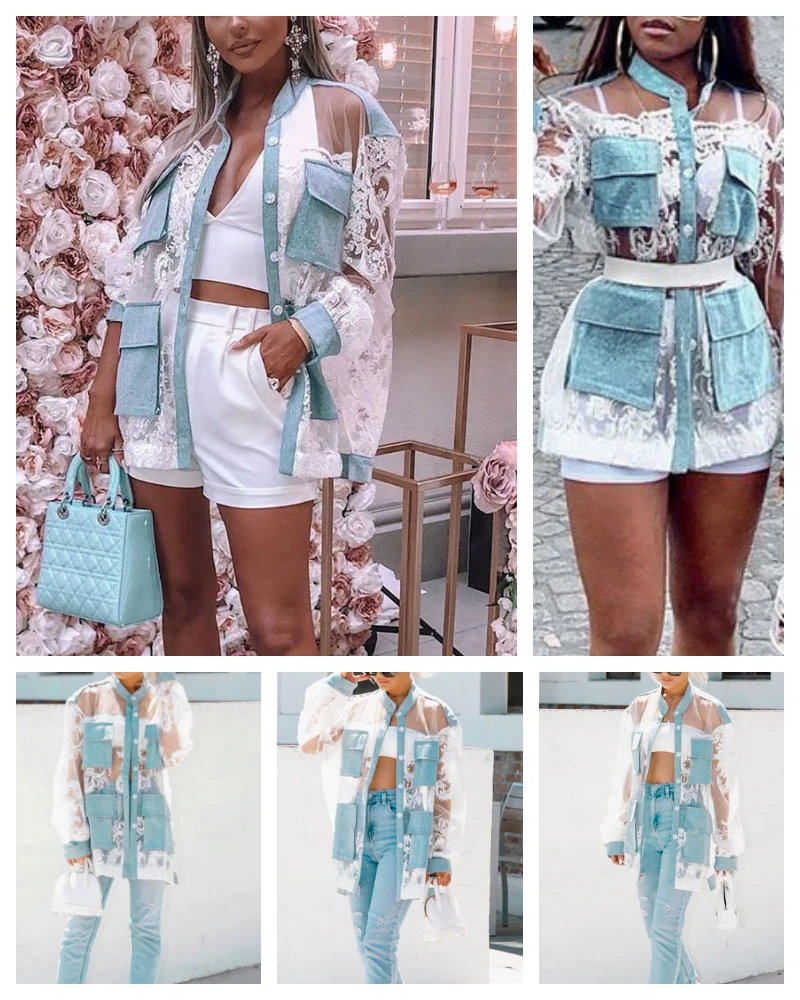 Shirt Blouse Denim Patchwork Streetwear Transparent Mesh Lace JKP3896