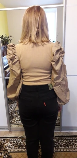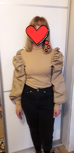 Great blouse! Sleeves are exactly the same as in the photo. True, I expected that the length of the jacket is standard, and it is shortened, under the high fit of the skirt or trousers