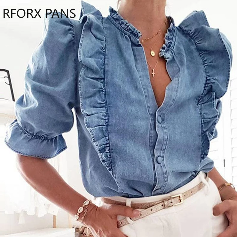 FREE SHIPPING Solid Color Ruffles Puffed Sleeve Blouse JKP2792