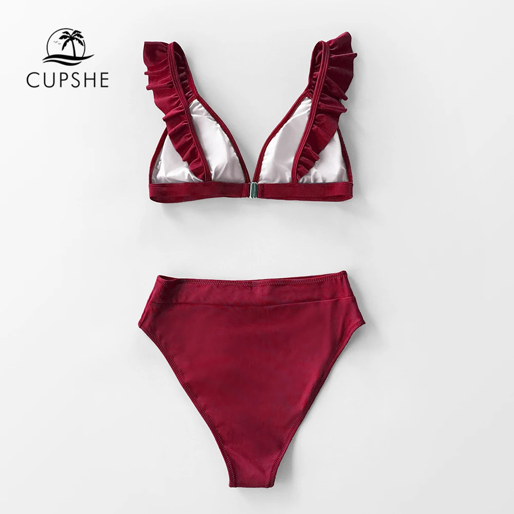 Solid Red Green Ruffled High-Waisted Bikini Sets Swimsuit Two Pieces