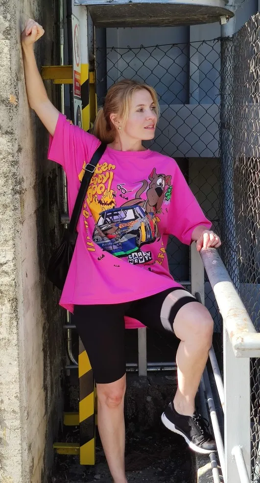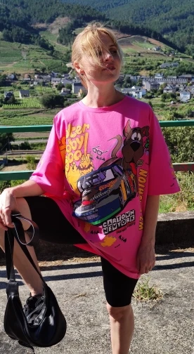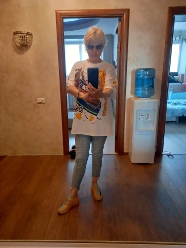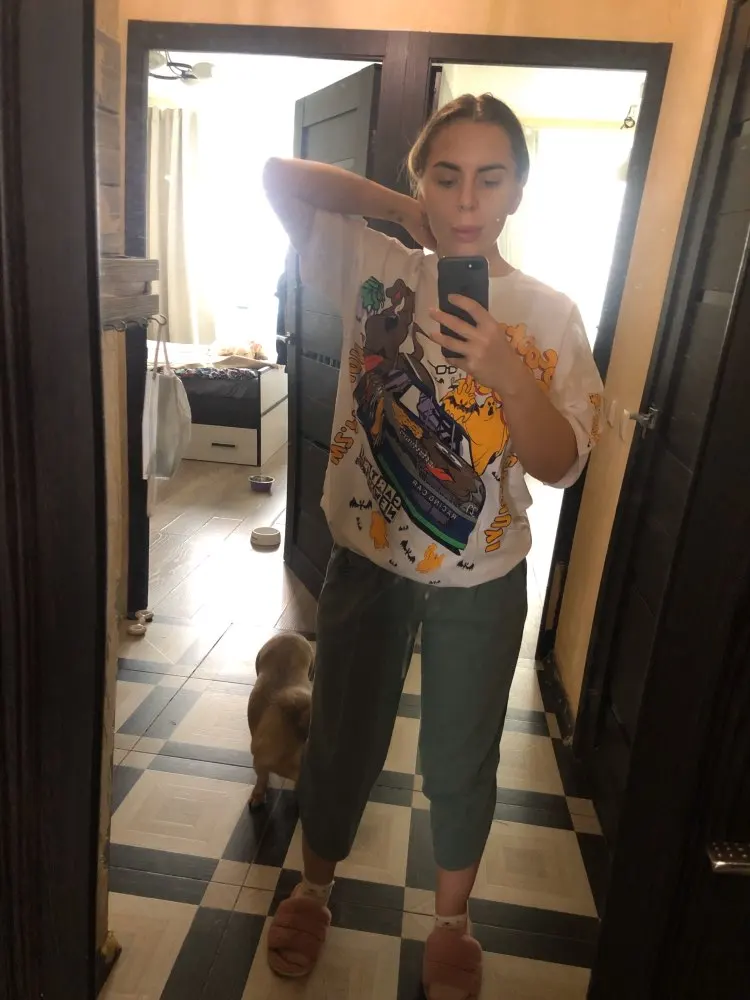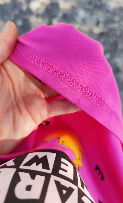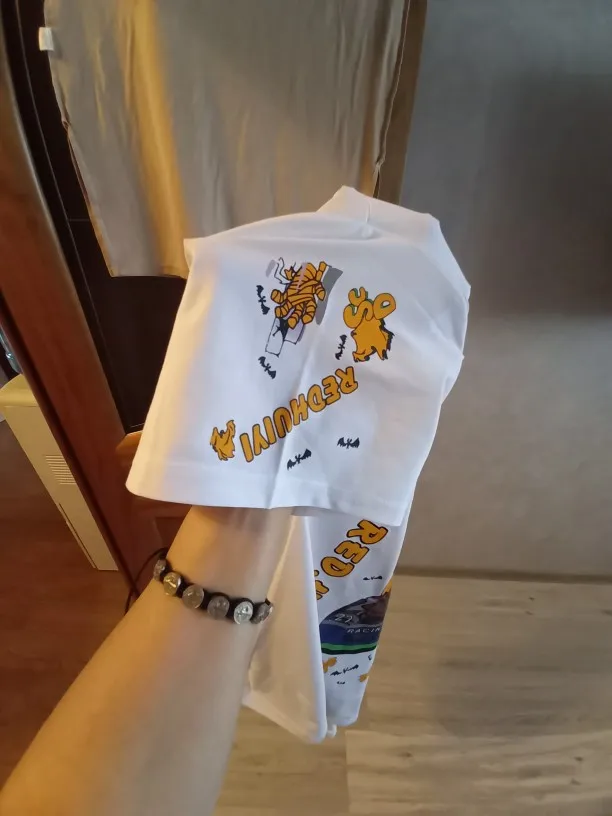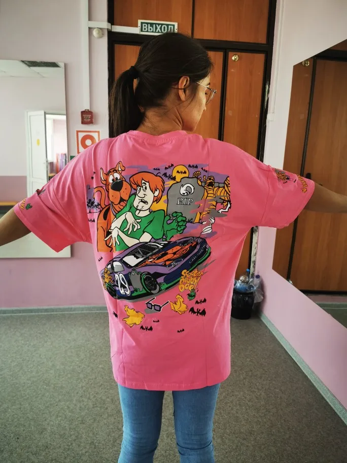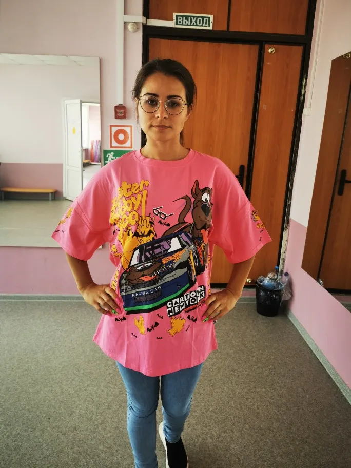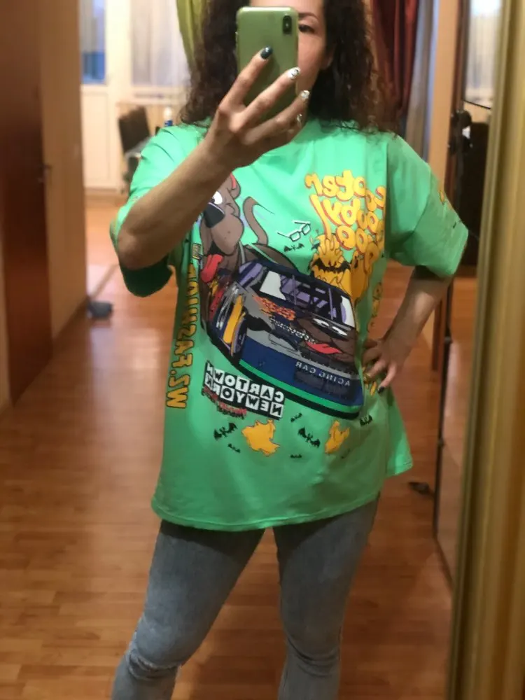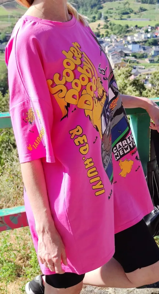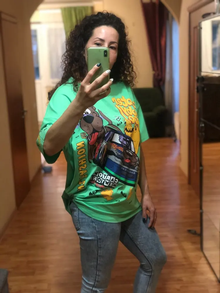 T-shirt with a cartoon print (rather than stickers) of incredible quality!! The colors are very bright: The store offers this model in yellow, light green, white and pink. Size uniform is suitable for sizes from 36 and to 46 euro sizes :)), probably. The T-shirt is huge! My size is 36 European, parameters: 88-70-95, height 168 Measurements: Length-80 Og-132 Shoulder-69 Quality chic! Material-high-quality cotton with a small percentage of elastin (slightly stretches) Delivery about 2 weeks # Very helpful