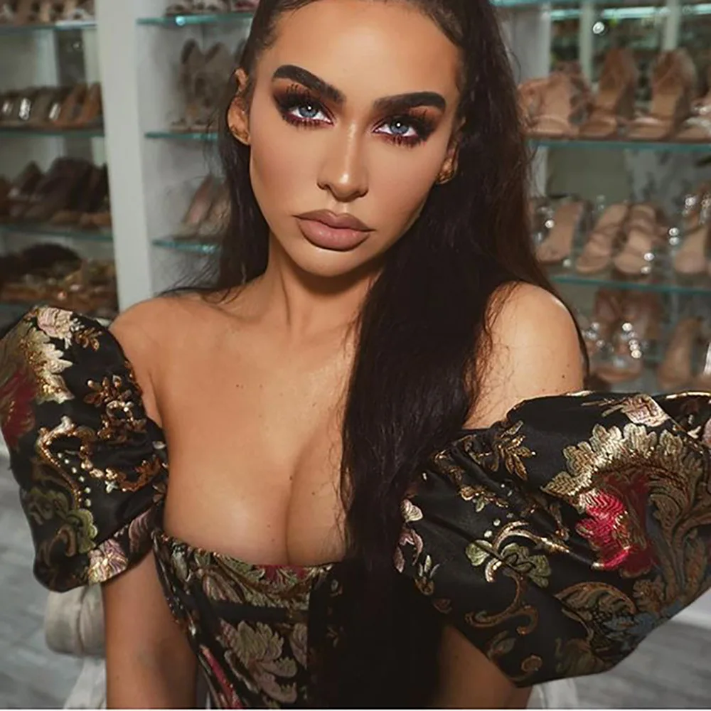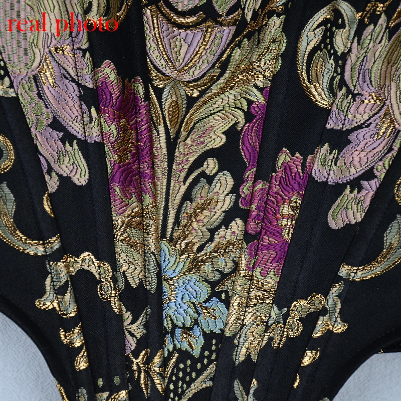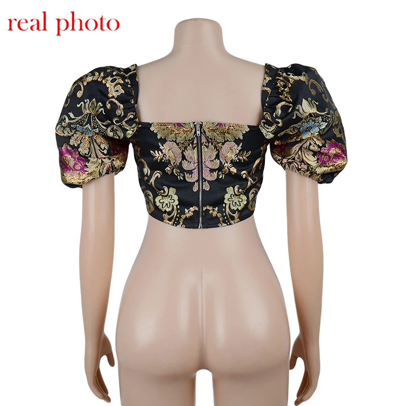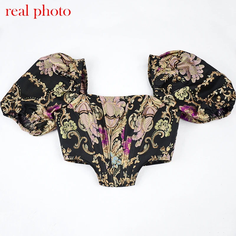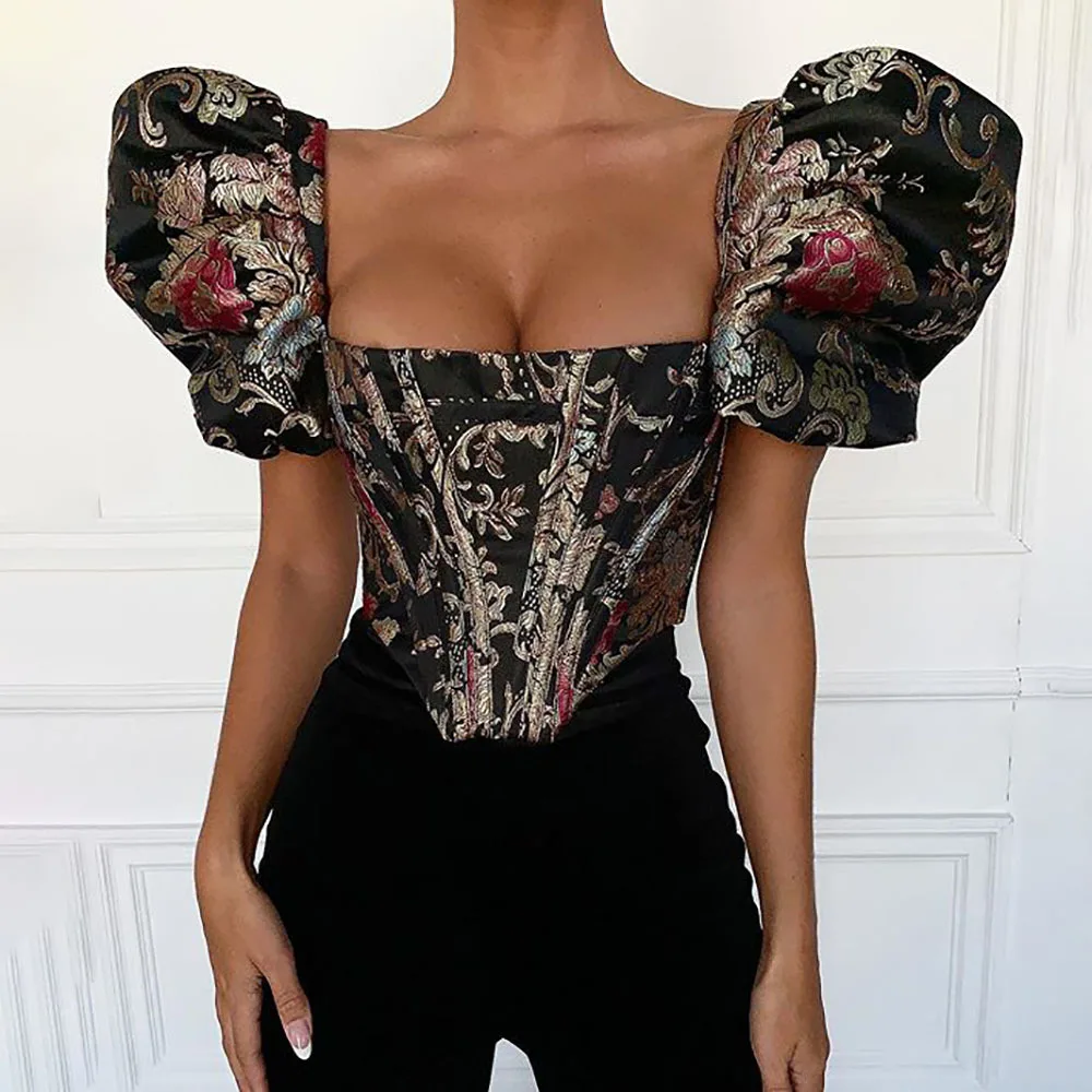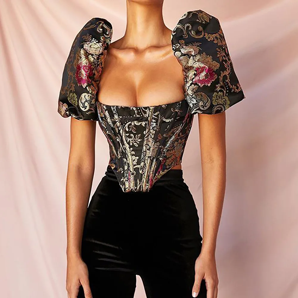 Square Collar Jacquard Boned Bustier Crop Tops Shirt Puff Sleeve