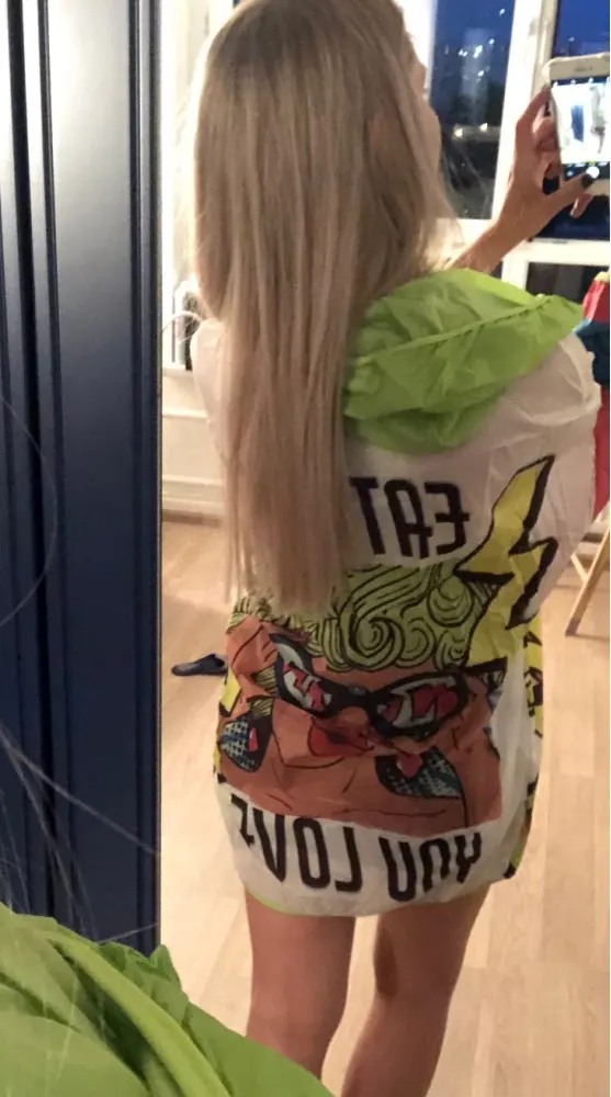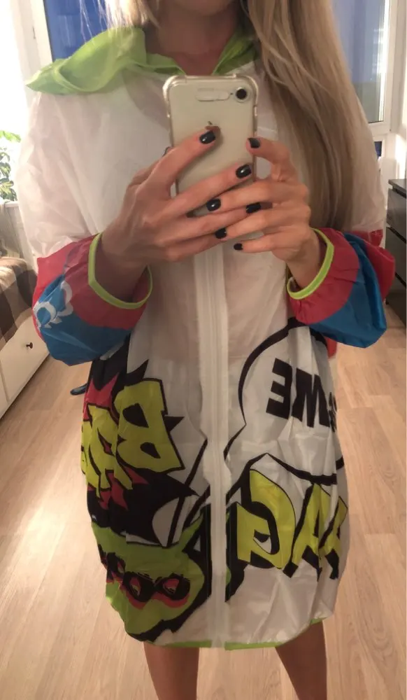 Ветровка, яркая красивая, непривычно длинная. Рукава была длиннее чем нужно, собрала в плечевом шве сборками, стало хорошо.