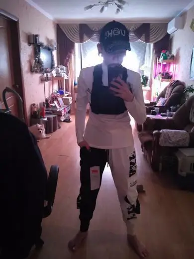 Pants made of dense fabric, look like in the photo in the description. In combination with multi-colored sneakers, you can scare passers-by)